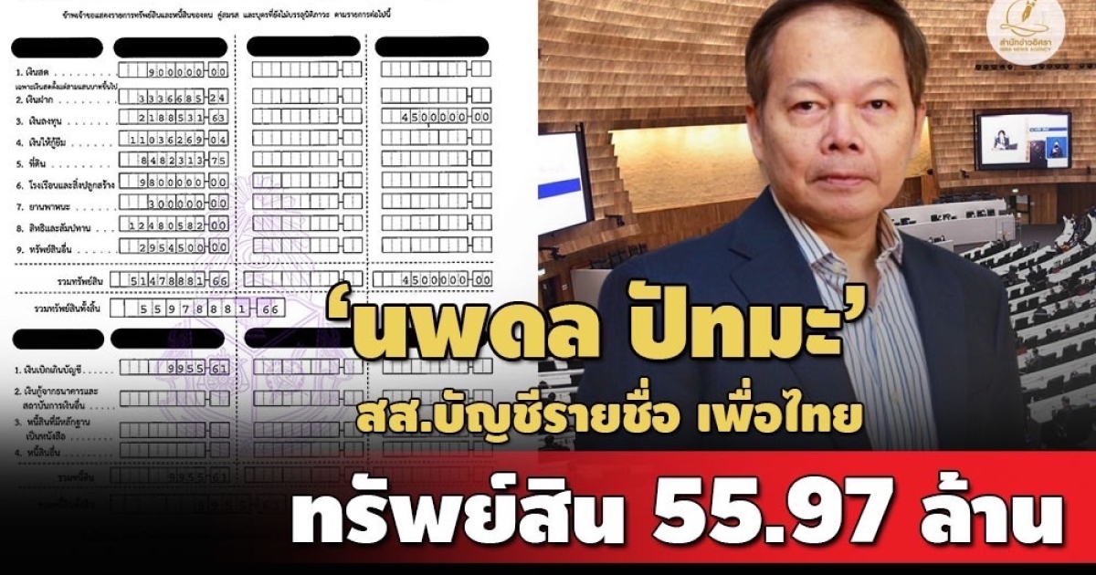 ป.ป.ช.เปิดบัญชีทรัพย์สิน 'นพดล ปัทมะ' สส.บัญชีรายชื่อ พรรคเพื่อไทย ทรัพย์สินกว่า 55 ล้าน มีเงินสด 9 แสน เงินฝาก 3.3 ล้าน เงินให้กู้ยืม 11 ล้าน สะสมอาวุธปืน 14 กระบอก นาฬิกา 9 เรือน พระเครื่อง 12 องค์ รายได้ 2.8 ล/ปี