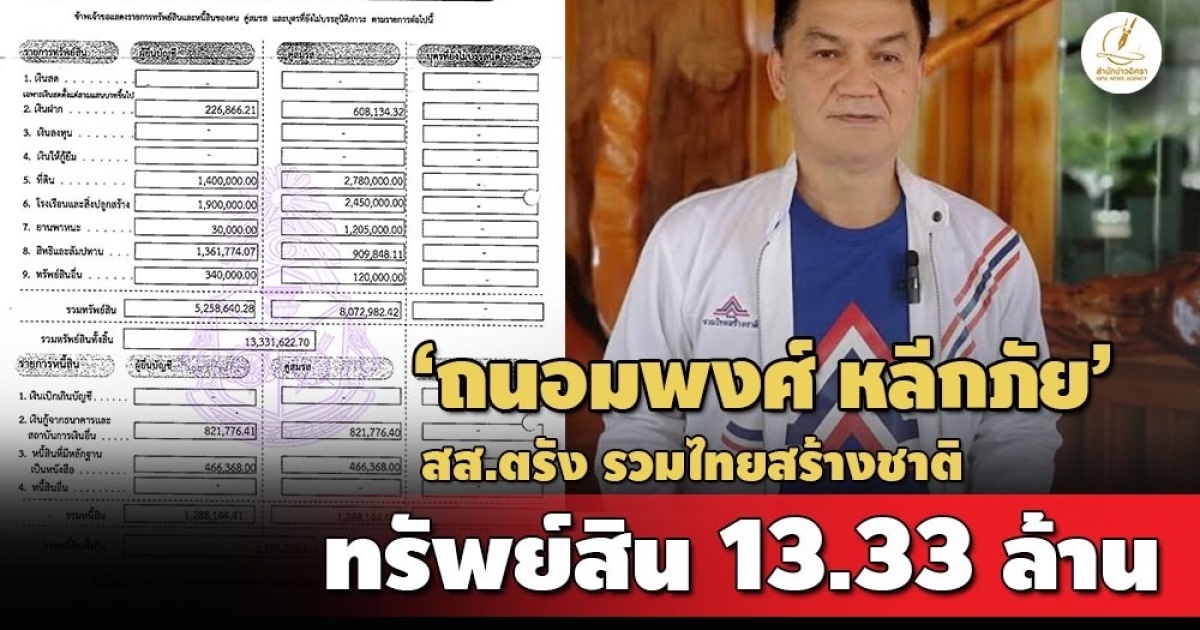 ป.ป.ช.เปิดบัญชีทรัพย์สิน 'ถนอมพงศ์ หลีกภัย' สส.ตรัง พรรครวมไทยสร้างชาติ ทรัพย์สินกว่า 13 ล้าน มีที่ดิน 3 แปลง สะสมอาวุธปืน รายได้ 8.5 แสน/ปี