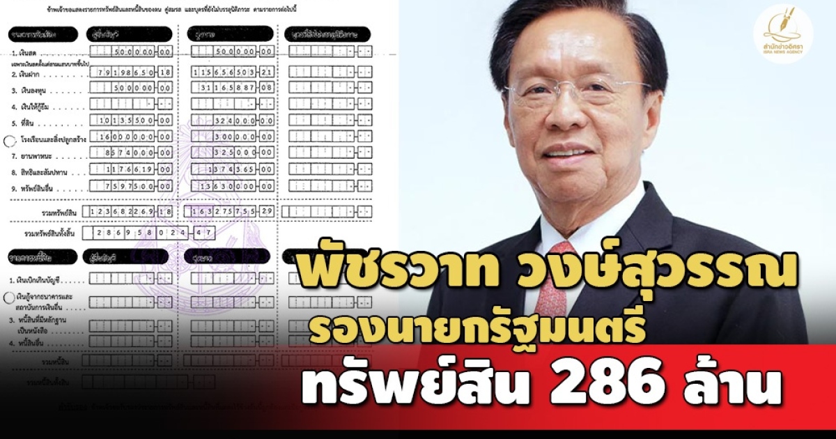 ป.ป.ช.เปิดบัญชีทรัพย์สิน 'พล.ต.อ.พัชรวาท วงษ์สุวรรณ' รองนายกรัฐมนตรี และ รมว.กระทรวงทรัพยากรธรรมชาติและสิ่งแวดล้อม มีทรัพย์สินกว่า 286 ล้าน มีเงินสด 5 แสน เงินฝาก 79 ล้าน สะสมพระเครื่อง รายได้ 6 แสน/ปี ภรรยามีเงินฝาก 115 ล้าน