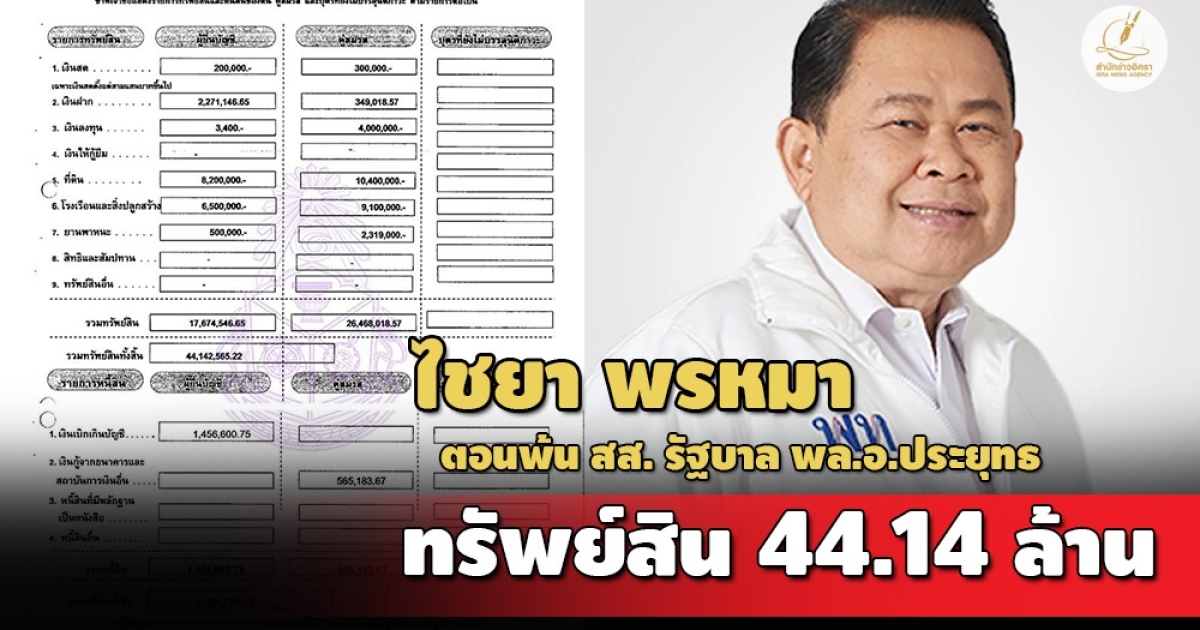 อย่างไรก็ดี เมื่อย้อนกลับไปในการยื่นบัญชีแสดงรายการทรัพย์สินและหนี้สินของนายไชยา พรหมา เมื่อครั้งกรณีพ้นตำแหน่ง สส.เพื่อไทย หนองบัวลำภู สมัยรัฐบาล พล.อ.ประยุทธ จันทร์โอชา เมื่อวันที่ 20 มี.ค. 2666 แจ้งมีทรัพย์สินพร้อมคู่สมรสทั้งสิ้น 44,142,565 บาท หนี้สิน 2,021,784 บาท