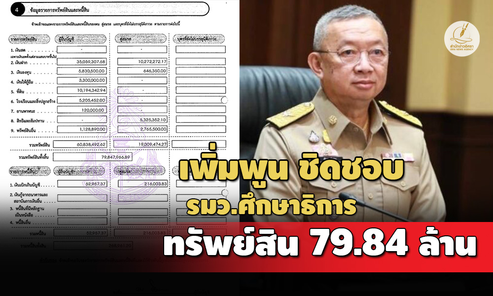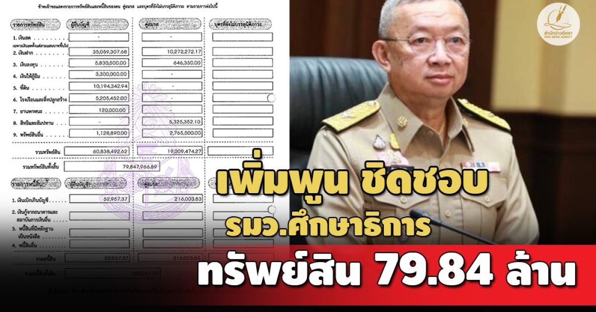 สำนักข่าวอิศรา (www.isranews.org) รายงานว่า เมื่อเร็ว ๆ นี้ สำนักงานคณะกรรมการป้องกันและปราบปรามการทุจริตแห่งชาติ (ป.ป.ช.) เปิดเผยบัญชีทรัพย์สินและหนี้สินของ พล.ต.อ.เพิ่มพูน ชิดชอบ กรณีข้ารับตำแหน่ง รัฐมนตรีว่าการกระทรวงศึกษาธิการ เมื่อวันที่ 5 ก.ย. 2566