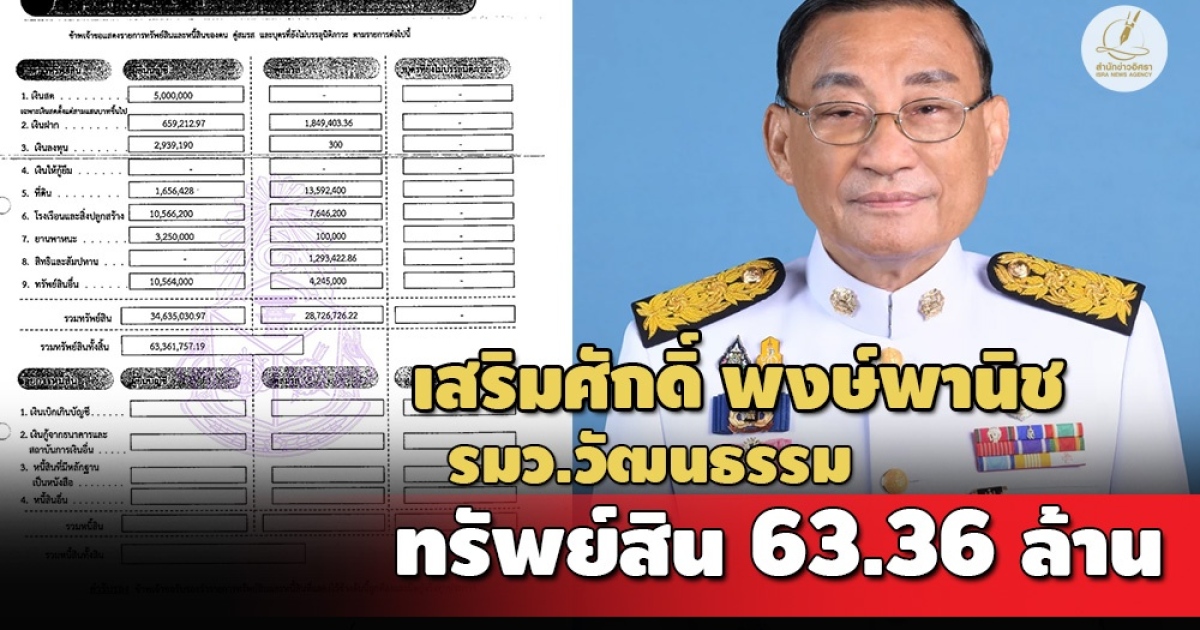 ป.ป.ช.เปิดบัญชีทรัพย์สิน 'เสริมศักดิ์ พงษ์พานิช' รมว.วัฒนธรรม มีทรัพย์สิน 63 ล้าน เงินสด 5 ล้าน ที่ดิน 11 แปลง สะสมสร้อยคอทองคำ-พระเครื่องเลี่ยมทอง รายได้ 2.8 ล./ปี