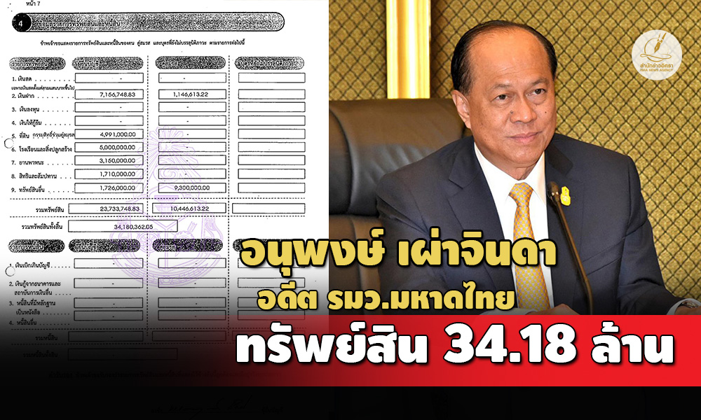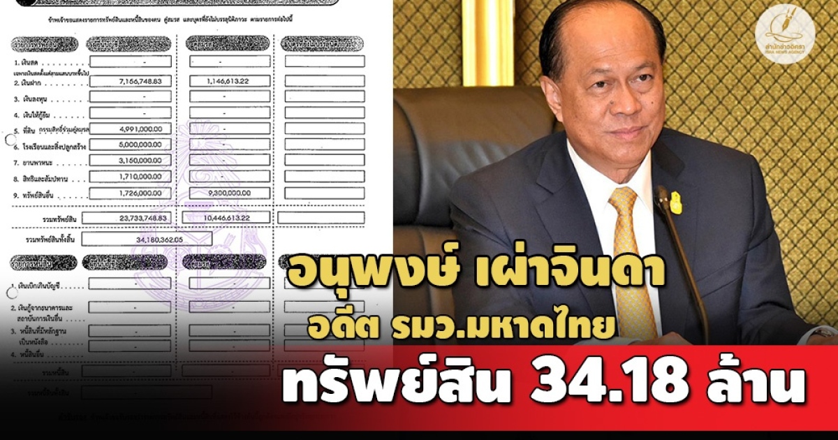 โดย พล.อ.อนุพงษ์ พร้อมด้วย นางกุลยา เผ่าจินดา คู่สมรส แจ้งมีทรัพย์สินทั้งสิ้น 34,180,362 บาท ไร้หนี้สิน