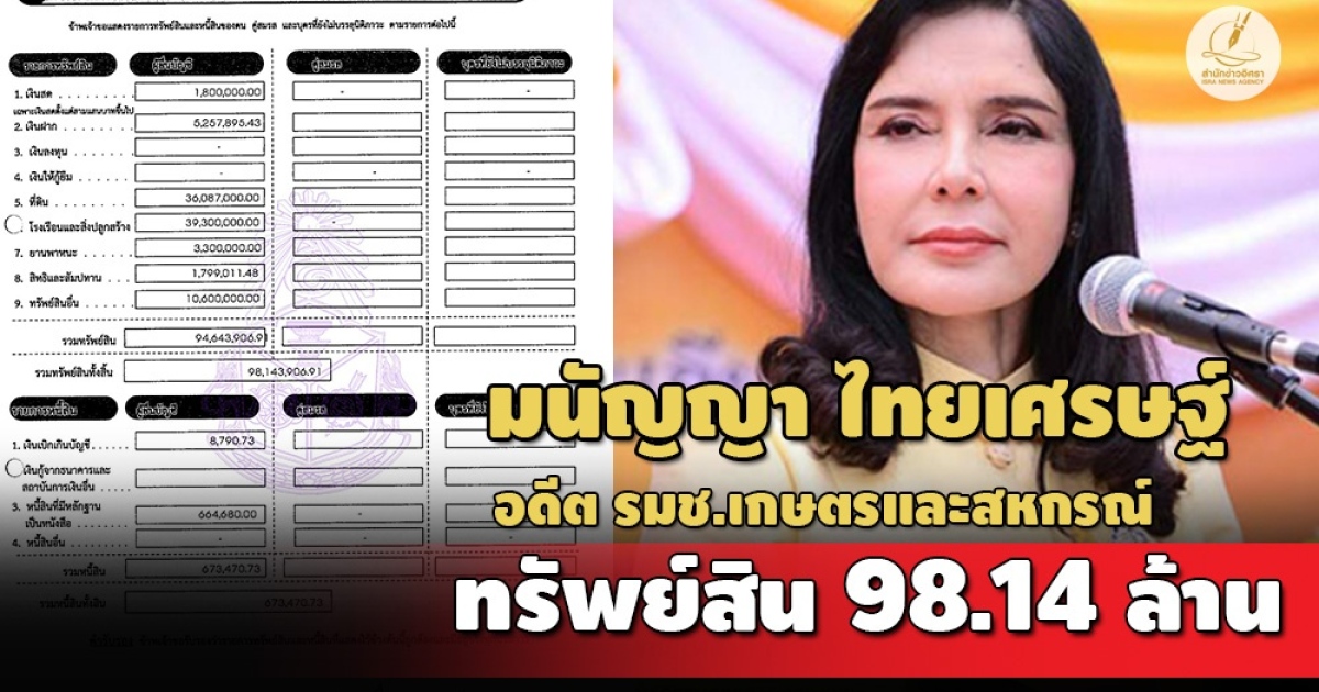 โดย น.ส.มนัญญา แจ้งมีทรัพย์สินทั้งสิ้น 98,143,906 บาท ประกอบด้วย เงินสด 1,800,000 บาท เงินฝาก 5,257,895 บาท ทั้งหมด 4 บัญชี