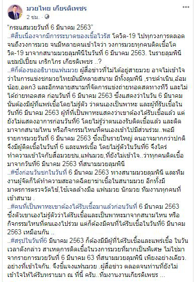 ก็ต้องขออธิบายแฟนมวย ผู้สื่อข่าวที่ไม่ได้อยู่สายมวย อาจไม่เข้าใจว่าในการแข่งชกมวยไทยมันมีหลายสนาม มีทั้งลุมพินี, ราชดำเนิน, อ้อมน้อย, อตก3 และอีกหลายสนามที่จัดการแข่งถ่ายทอดสดทางทีวี และไม่ได้ถ่ายทอดสด ก่อนวันที่ 6 มีนาคม 2563 ซึ่งแสดงว่าในวัน 6 มีนาคม นั่นต้องมีผู้ที่แพร่เชื้อโดยไม่รู้ตัว ว่าตนเองเป็นพาหะ และผู้ที่รับเชื้อในวันที่ 6 มีนาคม 2563 ผู้ที่เป็นพาหะแสดงว่าเขาต้องได้รับเชื้อแล้ว แต่ยังไม่แสดงอาการก่อนวันที่ 6 โดยไม่รู้ว่าตนเองรับติดเชื้อแล้ว และติดมาจากสนามไหน หรือกิจกรรมไหนที่ตนเองเข้าไปมีส่วนร่วม พอมีรายการมวยวันที่ 6 มีนาคม 2563 ซึ่งเป็นรายการใหญ่ คนอาจมากกว่าปกติ จึงมีผู้ติดเชื้อในวันที่ 6 และแพร่เชื้อ โดยไม่รู้ตัวในวันที่ 6 จึงใคร่ทำความเข้าใจกับสื่อมวยชน, แฟนมวย ที่ยังไม่เข้าใจ..ว่าทุกคนติดเชื้อมาจากวันที่ 6 มีนาคม 2563 ที่สนามมวยลุมพินี