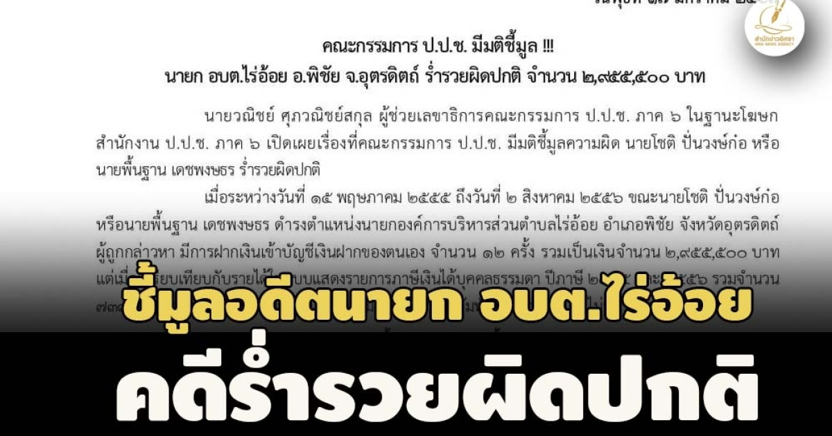 สำนักงาน ป.ป.ช.ภาค 6 แถลงมติคณะกรรมการชุดใหญ่ ชี้มูลความผิด 'โชติ ปั่นวงษ์ก๋อ' หรือ 'พื้นฐาน เดชพงษธร' อดีตนายก อบต.ไร่อ้อย อ.พิชัย จ.อุตรดิตถ์ คดีร่ำรวยผิดปกติ 2.9 ล้าน หลังสอบพบฝากเงินเข้าบัญชีตนเอง 12 ครั้ง ไม่สัมพันธ์รายได้