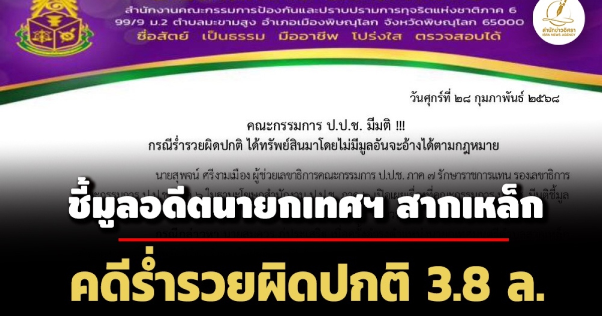 เผยมติ ป.ป.ช.ชี้มูลคดีกล่าวหา 'สมควร ภู่ประเสริฐ' อดีตนายกเทศมนตรีตำบลสากเหล็ก พิจิตร ร่ำรวยผิดปกติ 3,874,500 บาท ส่งสำนวน อสส. ยื่นคำร้องต่อศาลอาญาคดีทุจริตประพฤติมิชอบ ขอสั่งให้ทรัพย์สินตกเป็นของแผ่นดิน