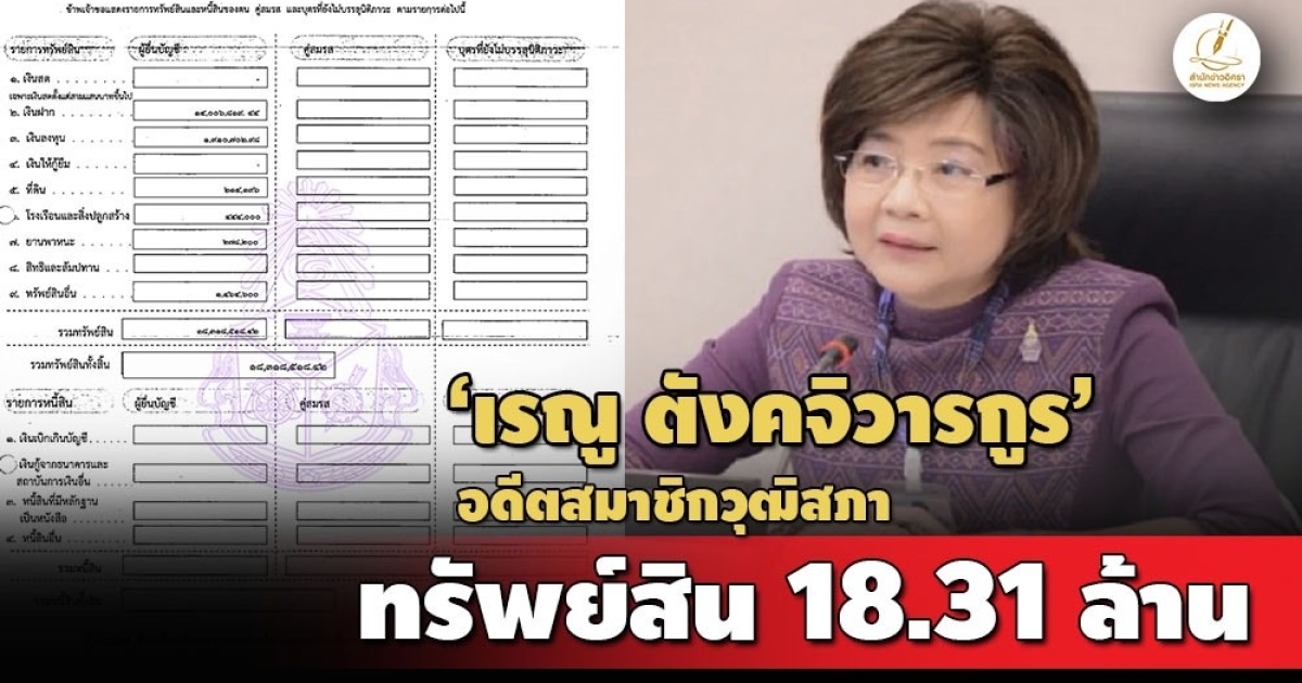ป.ป.ช.เปิดบัญชีทรัพย์สิน 'เรณู ตังคจิวางกูร' อดีตสมาชิกวุฒิสภา (สว.) ทรัพย์สินกว่า 18 ล้าน มีเงินฝาก 14 ล้าน สะสมแหวนเพชร-นาฬิหาหรู-เครื่องประดับ รายได้ 1.5 ล้าน/ปี