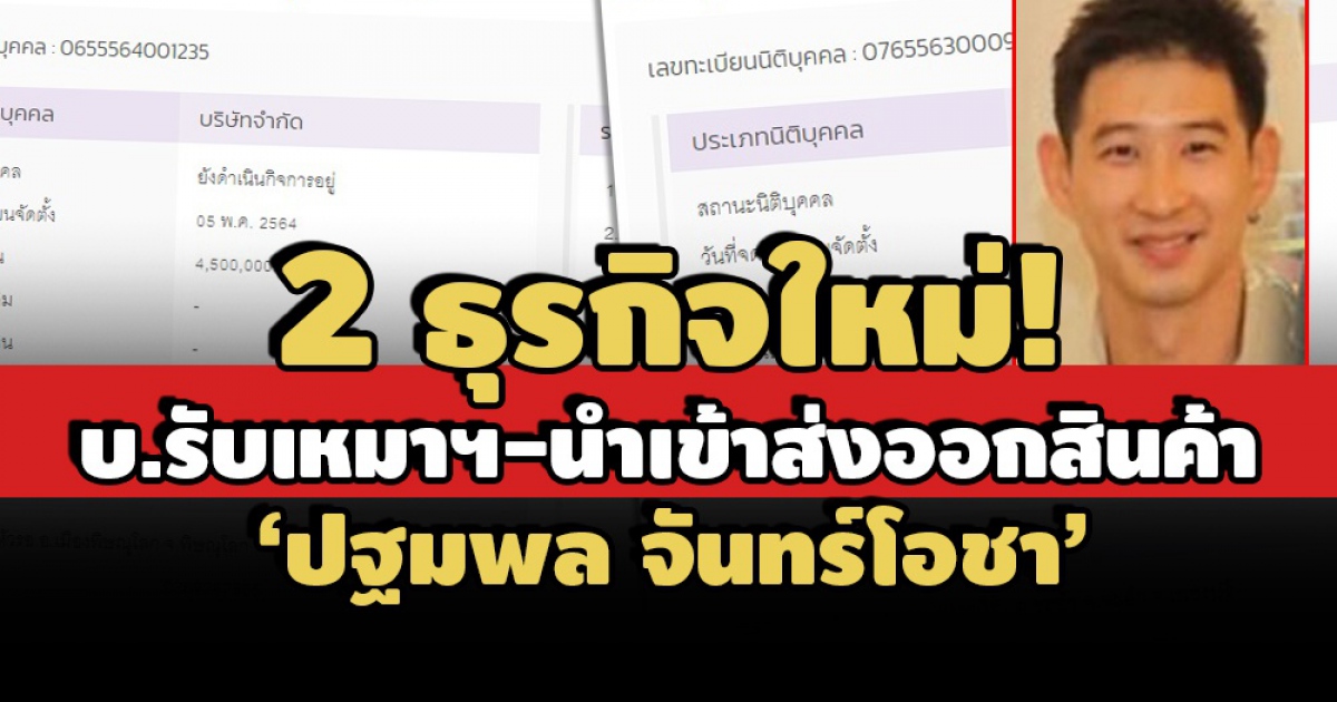เปิดตัว 2 ธุรกิจใหม่! ‘ปฐมพล จันทร์โอชา’ บ.พีทีที พาวเวอร์ฯ รับเหมาก่อสร้าง เพิ่งตั้ง พ.ค.64 ทุน 4.5 ล้าน อยู่ จ.พิษณุโลก - บ.อินดัสทรี ซัพพลาย โคฯ กิจการนำเข้า-ส่งออกสินค้า ตั้งอยู่ชะอำ จ.เพชรบุรี ทุน 5 ล้าน