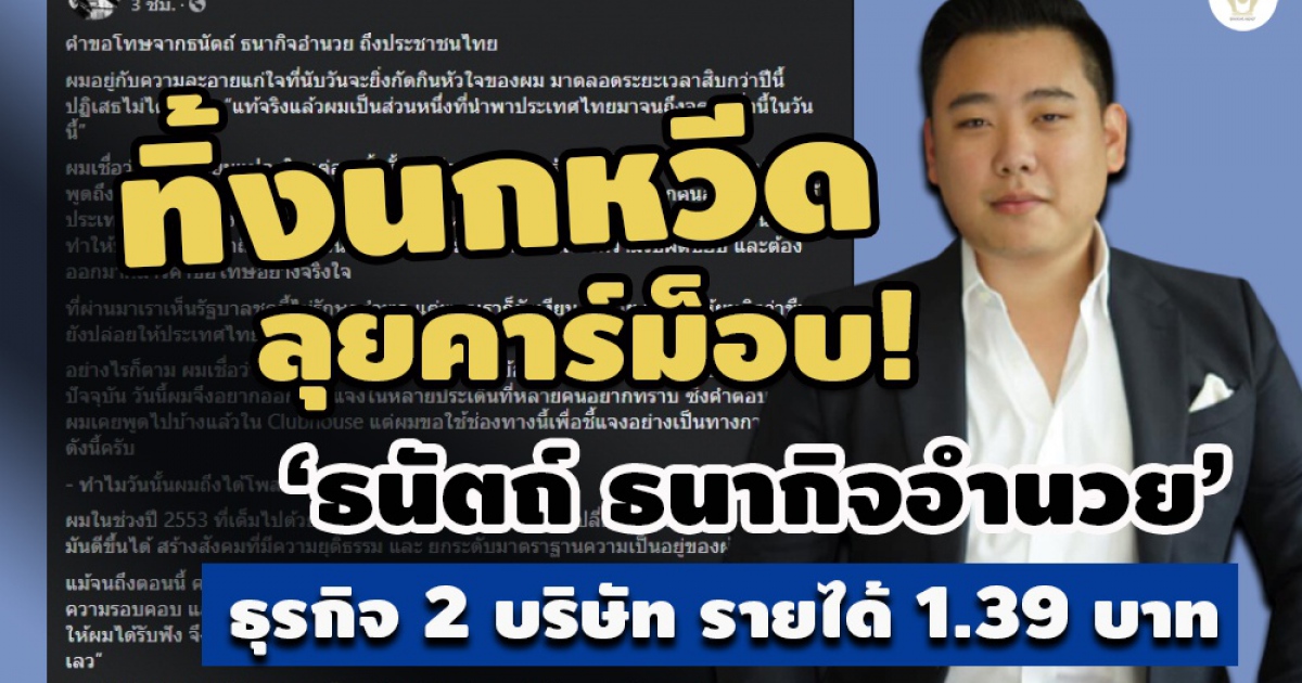 พลิกธุรกิจ ‘ธนัตถ์ ธนากิจอำนวย’ เคยร่วมเวที กปปส. ขับไล่ยิ่งลักษณ์ กลับหลังหันลุยคาร์ม็อบตะเพิด ‘บิ๊กตู่’ พ้นตำแหน่งนายกฯ เจ้าของธุรกิจ 2 บริษัท อสังหาฯ-อุปกรณ์การสื่อสาร รายได้ 1.39 บาท อีกแห่งไม่มี
