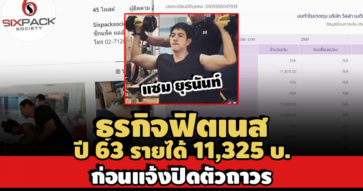 พลิกข้อมูลธุรกิจฟิตเนส Sixpack Society ‘แซม ยุรนันท์’ ก่อนแจ้งปิดถาวร เหตุได้รับผลกระทบจากโควิด-19 พบ บ.วิลล่า เมดิก้าฯ เป็นผู้ดำเนินการ แจ้งรายได้ล่าสุดปี 63 แค่ 11,325 บาท กำไรสุทธิ 1,325 บาท