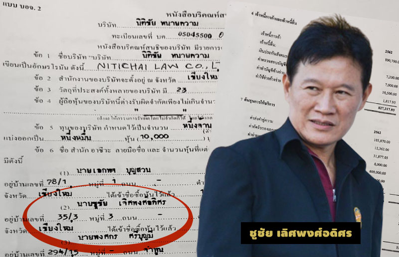 ล่าสุดสำนักข่าวอิศรา ตรวจสอบข้อมูลเอกสารจดทะเบียนจัดตั้ง บริษัท นิติชัย ทนายความ จำกัด จากกรมพัฒนาธุรกิจการค้าพบข้อมูลเพิ่มเติมว่า ในช่วงจดทะเบียนจัดตั้งเมื่อปี 2550 นายชูชัย เลิศพงศ์อดิศร ปรากฎชื่อเป็นหนึ่งในผู้ถือหุ้นบริษัทด้วย