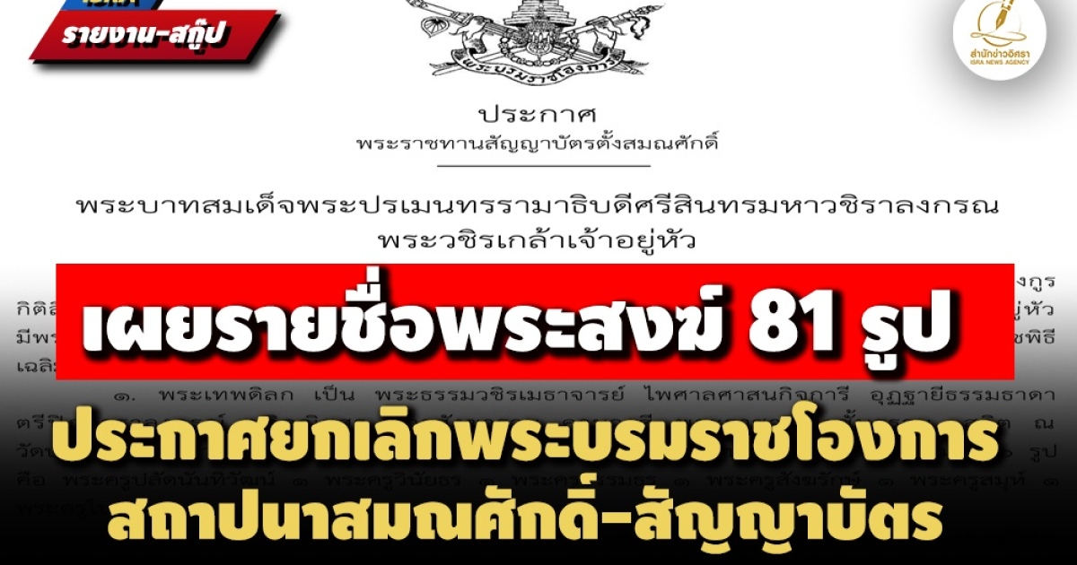 สำนักข่าวอิศรา (www.isranews.org) รายงานไปแล้วว่า เมื่อวันที่ 15 กรกฏาคม 2568 ราชกิจจานุเบกษา ได้เผยแพร่ประกาศยกเลิกพระบรมราชโองการประกาศสถาปนาสมณศักดิ์ และพระราชทานสัญญาบัตรตั้งสมณศักดิ์ พระสงฆ์ จำนวน 81 รูป