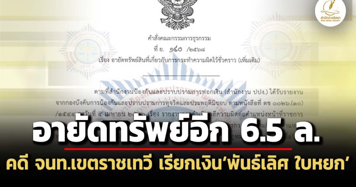 ปปง.อายัดทรัพย์ครั้ง 3 คดี จนท.เขตราชเทวี เรียก 3.2 ล. ‘พันธ์เลิศ ใบหยก’ผู้เสียหาย เงินฝาก กรมธรรม์ 12 รายการ 6.5 ล. ก่อนหน้าโดนยึดเงินสด 6 ล. พระเครื่องพระบูชา 10,887 องค์ กว่า 14.6 ล. ล่าสุดศาลอาญาคดีทุจริตพิพากษาจำคุก 8 ปี