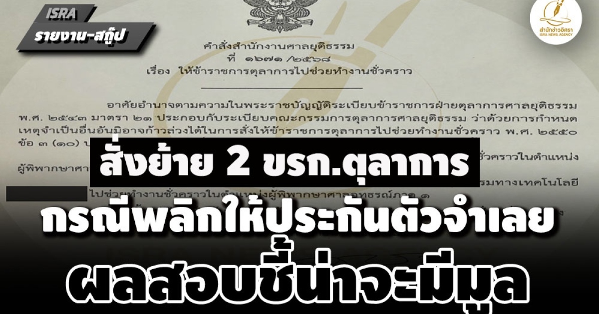 'อดิศักดิ์ ตันติวงศ์' ปธ.ศาลฏีกา ลงนามคำสั่งย้ายข้าราชการตุลาการ 2 ราย กรณีพลิกให้ประกันตัวจำเลย อนุญาตวันเดียว 5 คดีรวด ไปช่วยทำงานชั่วคราว หลังผลสืบสวนเบื้องต้นข้อกล่าวหาน่าจะมีมูล เตรียมแต่งตั้งคกก.สอบสวนทางวินัยร้ายแรงต่อไป
