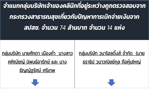 สำนักข่าวอิศรา (www.isranews.org) รายงานไปแล้วว่า บริษัทเอกชน 14 แห่ง ที่ปรากฎชื่อเป็นเจ้าของคลินิก 18 แห่ง ในกรุงเทพมหานคร (กทม.) ที่ถูกกระทรวงสาธารณสุข (สธ.) ตรวจสอบพบปัญหาการเบิกจ่ายเงินจาก สำนักงานหลักประกันสุขภาพแห่งชาติ (สปสช.) ในส่วนประเภทบริการสร้างเสริมสุขภาพและป้องกันโรคเพื่อให้ลงพื้นที่ชุมชนตรวจหาโรคเรื้อรัง กลุ่มเมตาบอลิก โดยรัฐสนับสนุบเงินประมาณ 400 บาทต่อหัว แต่ไม่ได้ให้บริการจริง จนนำไปสู่การเรียกคืนเงิน 74 ล้านบาทเศษนั้น
