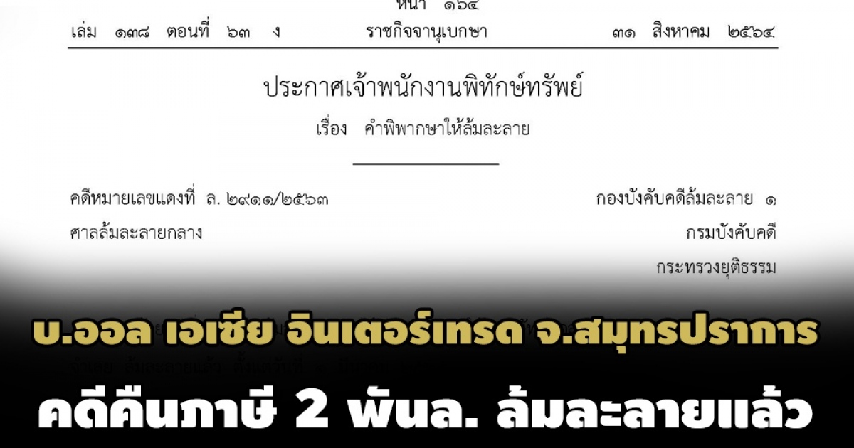 แพร่ประกาศเจ้าพนักงานพิทักษ์ทรัพย์ บ.ออล เอเซีย อินเตอร์เทรด อ้างขายอุปกรณ์ไฟฟ้า จ.สมุทรปราการ คดีคืนภาษีมูลค่าเพิ่ม 2 พันล.ฉาว สรรพากร ล้มละลายแล้ว