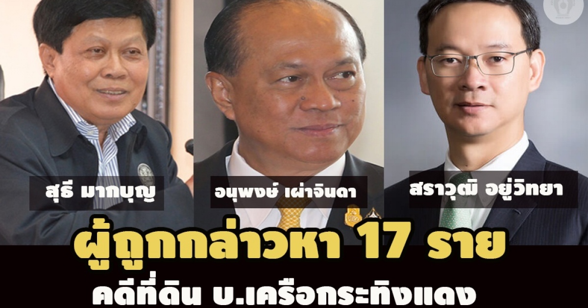 สำหรับรายชื่อผู้ถูกล่าวหาจำนวน 17 ราย นั้น รายชื่อบุคคลสำคัญ นอกจาก พล.อ.อนุพงษ์ เผ่าจินดา รัฐมนตรีว่าการกระทรวงมหาดไทย แล้ว ยังมี นายสุธี มากบุญ รัฐมนตรีช่วยว่าการกระทรวงมหาดไทย ผู้ว่าราชการจังหวัด นายกอำเภอ บริษัท เคทีดี พร็อพเพอร์ตี้ ดีเวลลอปเมนท์ จำกัด ผู้บริหารบริษัทฯ คือ นายสราวุฒิ อยู่วิทยา น.ส. นุชรี อยู่วิทยา ด้วย