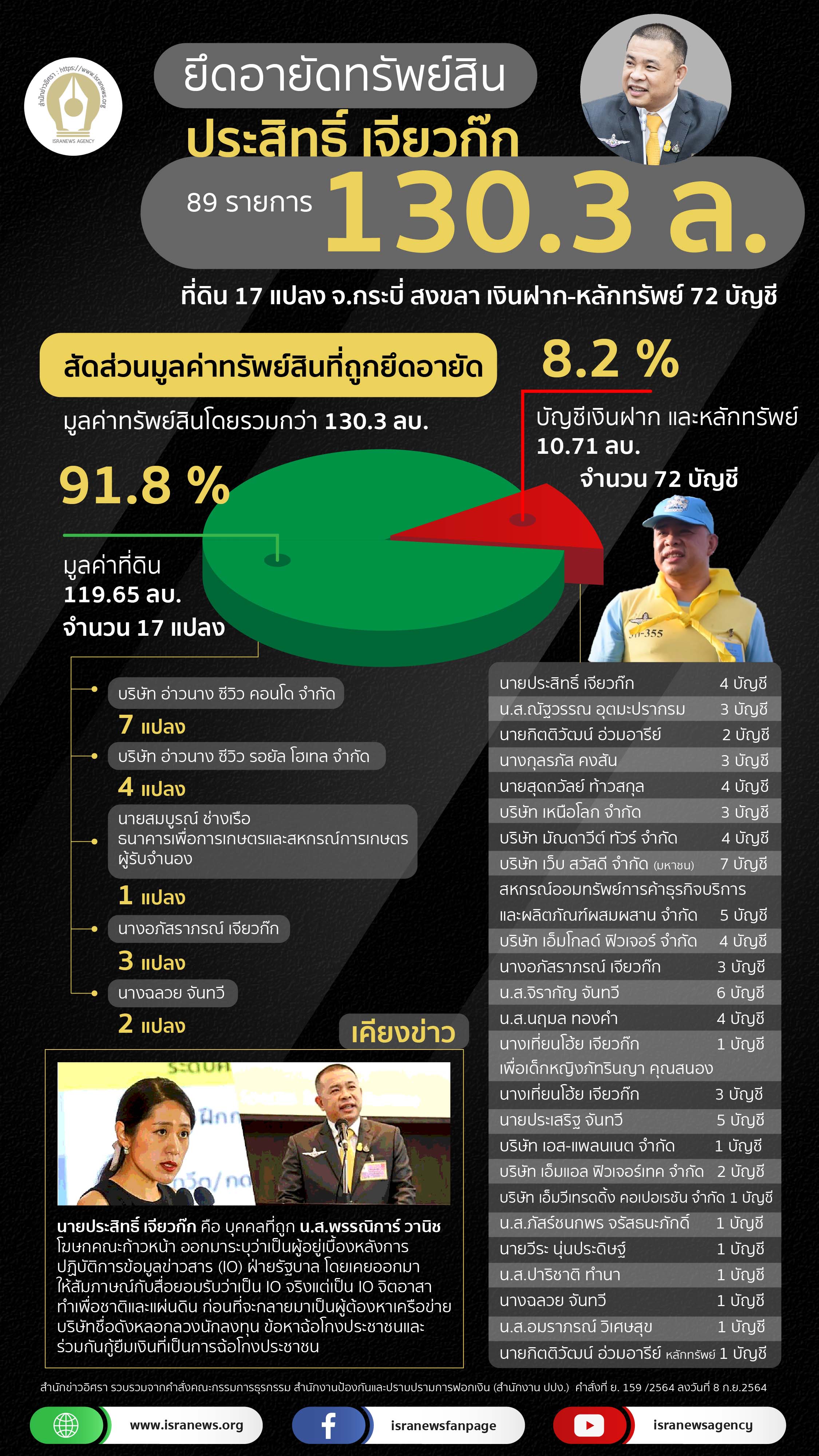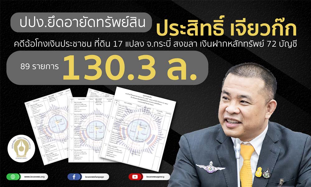 สำนักข่าวอิศรา(www.isranews.org) รายงานไปแล้วว่า เมื่อเร็ว ๆ นี้ คณะกรรมการธุรกรรม สํานักงานป้องกันและปราบปรามการฟอกเงิน (สํานักงาน ปปง.) มีคำสั่งที่ ย. 159 /2564 ลงวันที่ 8 ก.ย.2564 ยึดและอายัดทรัพย์สินที่เกี่ยวกับการกระทําความผิดไว้ชั่วคราวราย นายประสิทธิ์ เจียวก๊ก กับพวก มีพฤติการณ์กระทําความผิดเกี่ยวกับการฉ้อโกงประชาชน ทรัพย์สินที่ถูกยึดและอายัดรวม 89 รายการ รวมมูลค่า 130,371,449.55 บาท ประกอบด้วย ที่ดิน 17 แปลง ราคาประเมิน 119,653,534.91 บาท เงินในบัญชีเงินฝาก 71 บัญชี และหลักทรัพย์ 1 บัญชี รวม 72 บัญชี 10,717,964.64 บาท