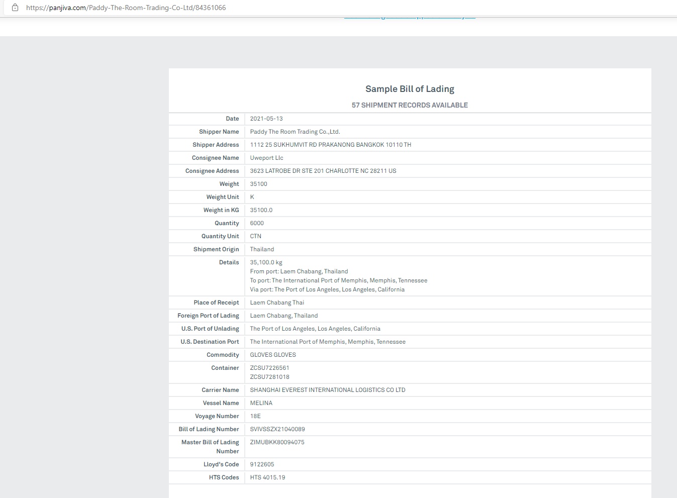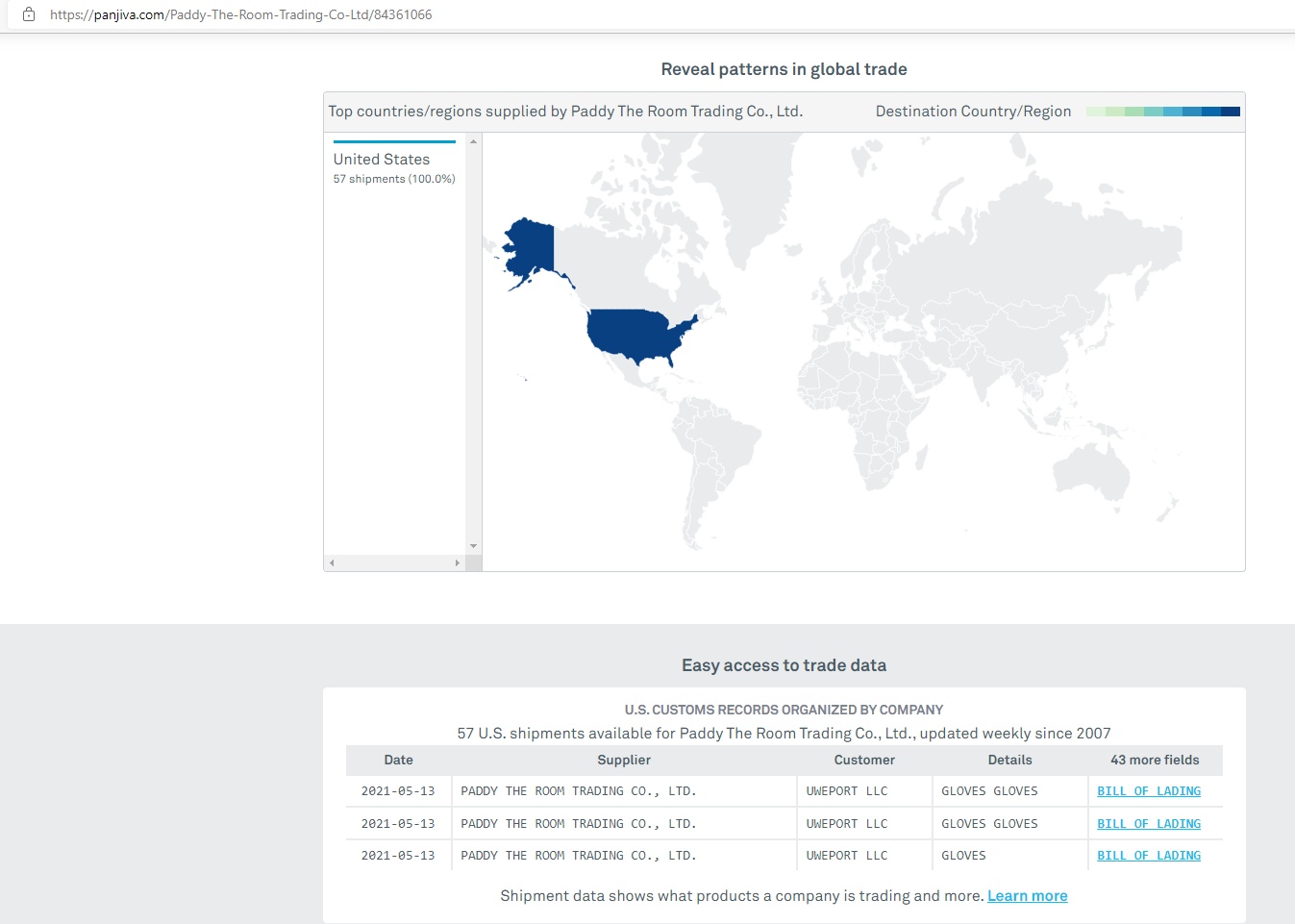 ข้อมูลการขนส่งถุงมือบนของบริษัท Paddy The Room Trading ไปยังสหรัฐอเมริกาบนเว็บไซต์ Panjiva