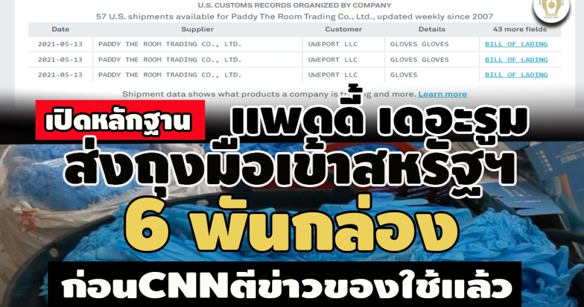 "...ในช่วงประมาณวันที่ 13 พ.ค. 2564 มีการขนส่งสินค้าจำนวน 57 รายการ ในการขนส่งทางเรือ 1 เที่ยว ซึ่งมีการระบุชื่อผู้ส่งของคือบริษัท Paddy The Room Trading Co., Ltd. ระบุสินค้าถุงมือยาง คิดเป็นจำนวนทั้งสิ้น 6,000 กล่อง น้ำหนักทั้งสิ้น 35.1 ตัน หรือประมาณ 35,100 กิโลกรัม แสดงรายละเอียดการเดินทาง ใช้บริการเรือขนส่งที่ชื่อว่า Melina ออกเดินทางจากท่าเรือแหลมฉบังประเทศไทย เข้าสู่สหรัฐฯ ผ่านท่าเรือลอสแองเจลิส นครลอสแองเจลิส รัฐแคลิฟอร์เนีย มีปลายทางอยู่ที่ท่าเรือนานาชาติเมมฟิส เมืองเมมฟิส รัฐเทนเนสซีย์ รายละเอียดผู้ดำเนินการขนส่ง คือ บริษัท SHANGHAI EVEREST INTERNATIONAL LOGISTICS CO LTD ปรากฏชื่อผู้รับสินค้า คือ บริษัท Uweport Llc จำกัด ..."