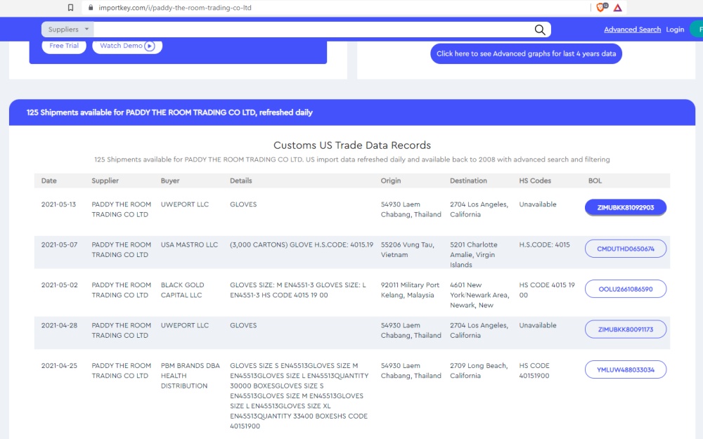3.เมื่อวันที่ 2 พ.ค. บริษัทแพดดี้ เดอะรูมฯ ส่งออกถุงมือไซส์ L (ไม่ระบุจำนวนบนเว็บไซต์)ไปให้กับผู้ซื้อ คือ บริษัท BLACK GOLD CAPITAL LLC โดยส่งออกจากท่าเรือทหาร Port Kelang ประเทศมาเลเซีย ไปยังท่าเรือนวาร์ก นครนิวยอร์ก รัฐนิวยอร์ก