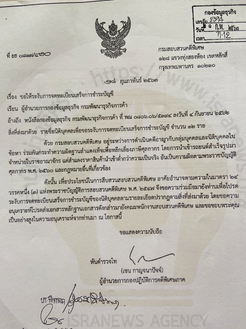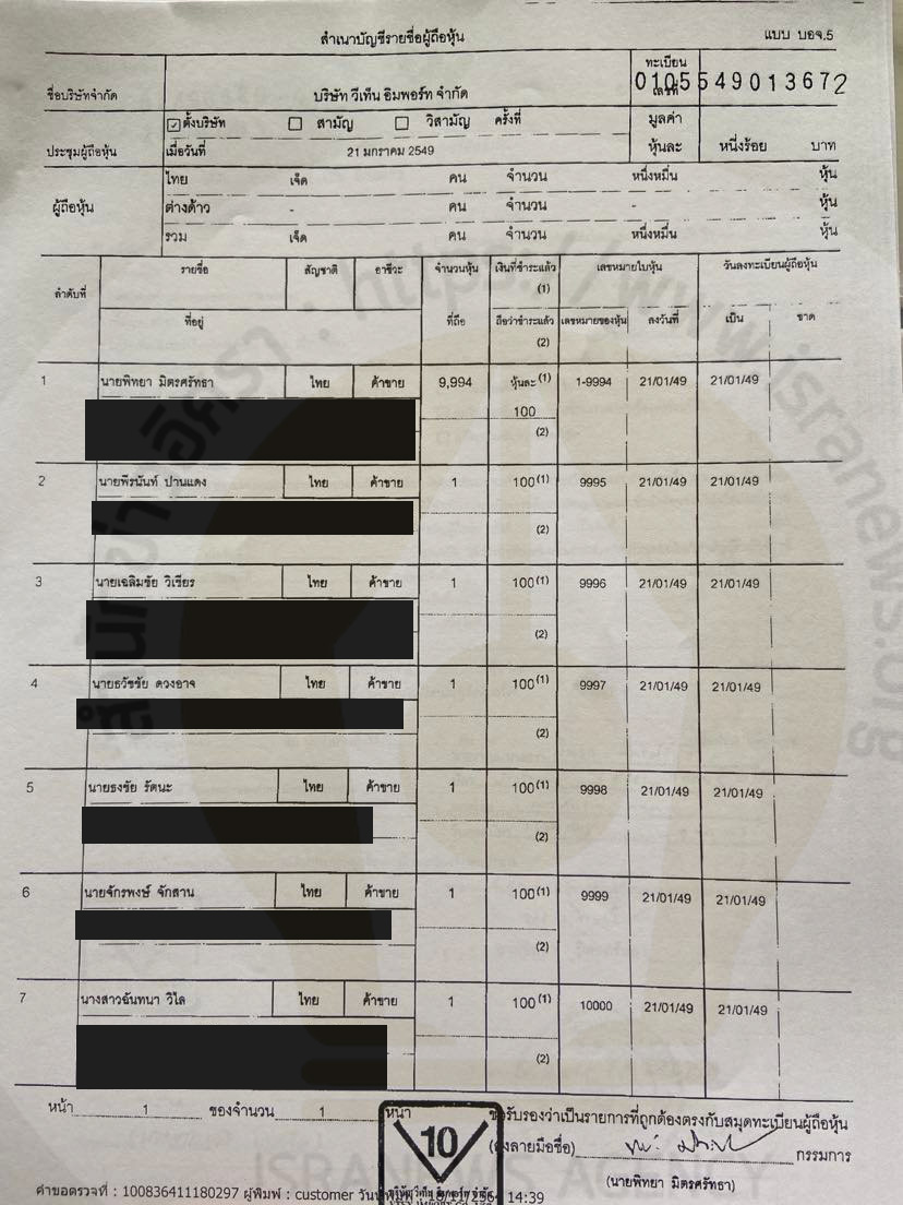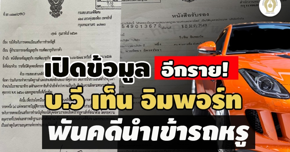 เปิดข้อมูล บ.วี เท็น อิมพอร์ท พันคดีนำเข้ารถหรู ทุนจดทะเบียน 1 ล้าน ผู้ถือหุ้นใหญ่-กรรมการคนเดียว โดนดีเอสไอ กรมสรรพากร ศุลกากร อายัดจดทะเบียนฯเกือบ 60 ครั้ง ปี 2552-2564