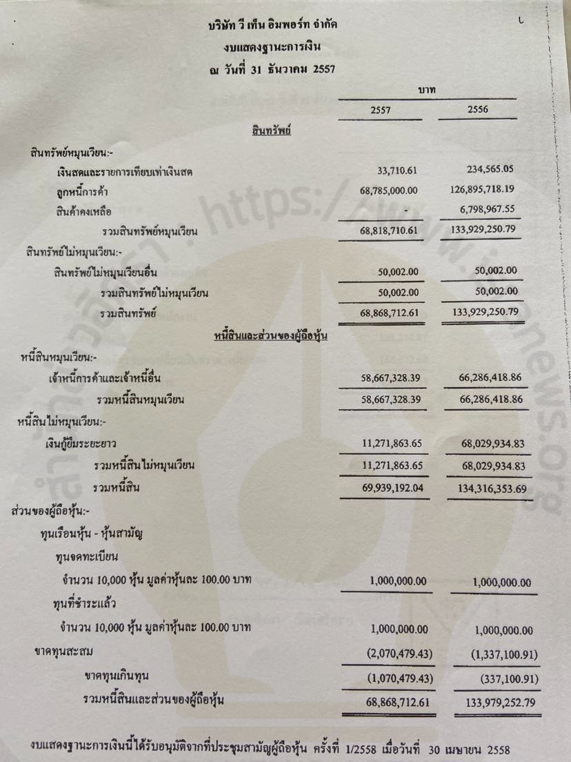งบดุล สินทรัพย์รวม 68,868,712.61 บาท หนี้สิน 69,939,192.04 บาท ขาดทุนสะสม 2,070,479.43 บาท