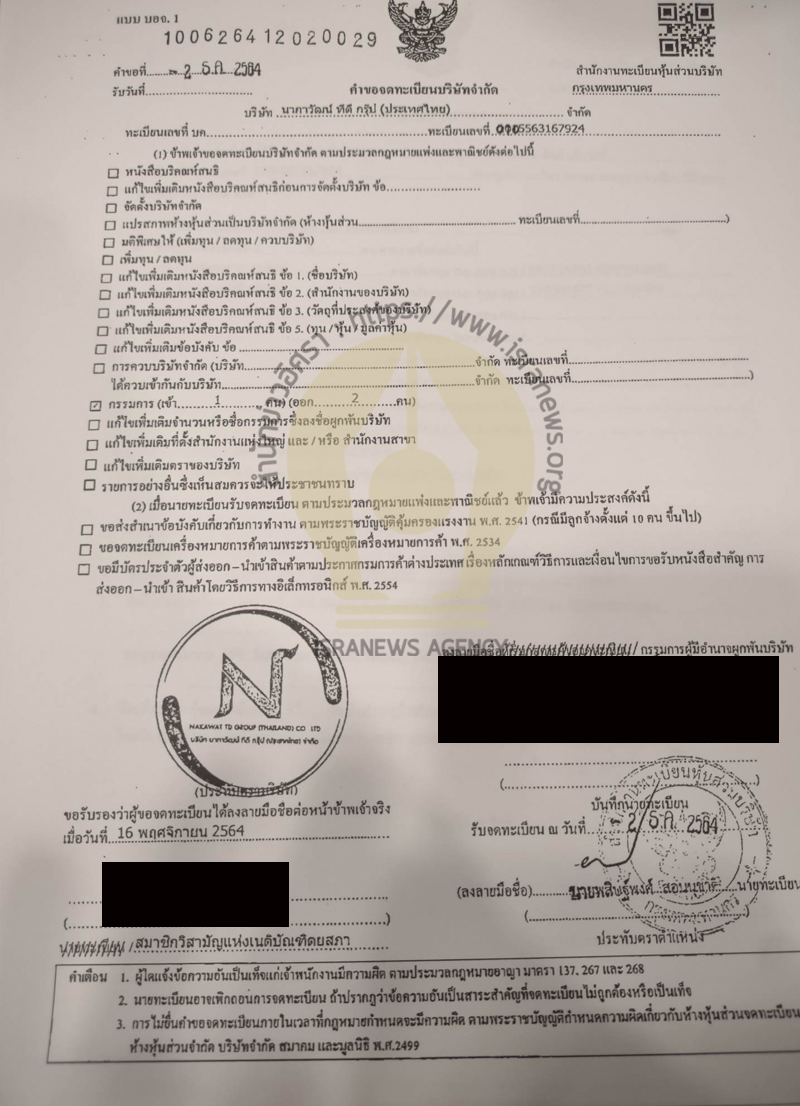 โดยความเกี่ยวข้องของคนในครอบครัวนักการเมืองรายแรกนั้น สำนักข่าวอิศรา สืบค้นข้อมูลเอกสารจดทะเบียนจัดตั้งบริษัทนากาวัฒน์ มีบุคคลนามสกุลคล้ายกับ นักการเมืองชื่อดังจังหวัดหนึ่งในภาคอีสานรวมถือหุ้นอยู่ด้วย และเพิ่งจะถอนชื่อออกกรรมการบริหารบริษัทนากาวัฒน์ฯ ไปในช่วงกลางเดือน พ.ย. 2564 ที่ผ่านมา ขณะที่เอกสารการแบบ บอจ.1 หรือว่าคำขอจดทะเบียนบริษัทนั้นได้ลงรายละเอียดการเปลี่ยนกรรมการผู้ถือหุ้นไว้ว่าอยู่ ณ วันที่ 2 ธ.ค. 2564 (ดูภาพประกอบ)