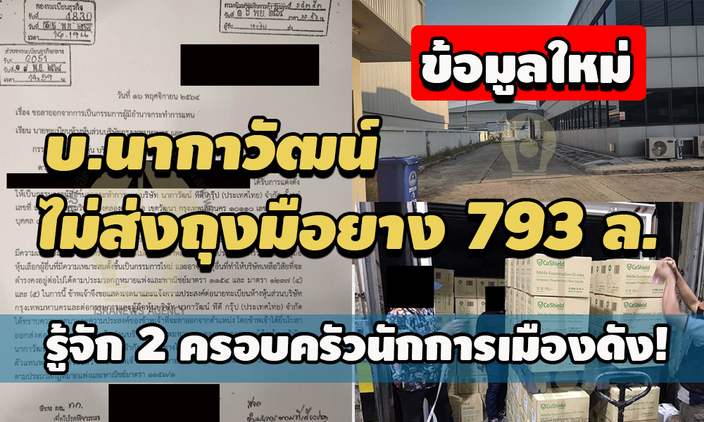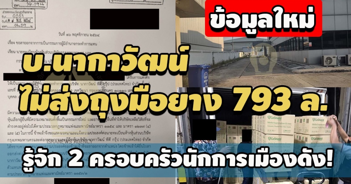 'ข้อมูลใหม่' พบ 2 ครอบครัวนักการเมืองเอี่ยว บ.นากาวัฒน์ คู่กรณีเบี้ยวส่งออกถุงมือยาง บ.นิวซีแลนด์ 793 ล.-ข้อมูลเอกสารเผยมี กก.บริษัทนามสกุลคล้ายนักการเมืองภาคอีสานถอนชื่อออกจากกรรมการบริหารไปตอนเดือน พ.ย. ขณะอีกครอบครัวนักการเมือง พบสมาชิกเคยให้เครดิต กก.บริษัทว่าจะคืนเงินให้