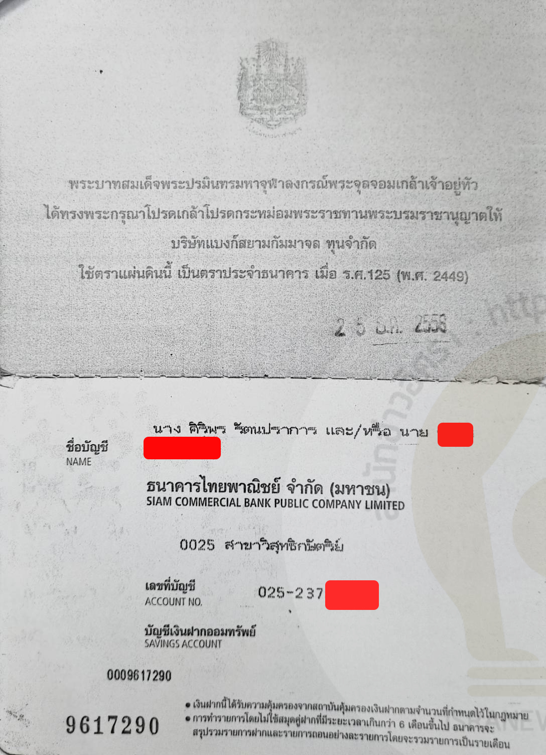 โดยบัญชีธนาคารดังกล่าว คือ บัญชีธนาคารไทยพาณิชย์ เลขที่ 0252379XX-X ระบุชื่อเจ้าของบัญชี คือ นางศิริพร รัตนปราการ และ /หรือ นาย .... (เป็นชื่อและนามสกุลของนายตำรวจระดับสูง แต่ไม่ได้มีการระบุยศ)