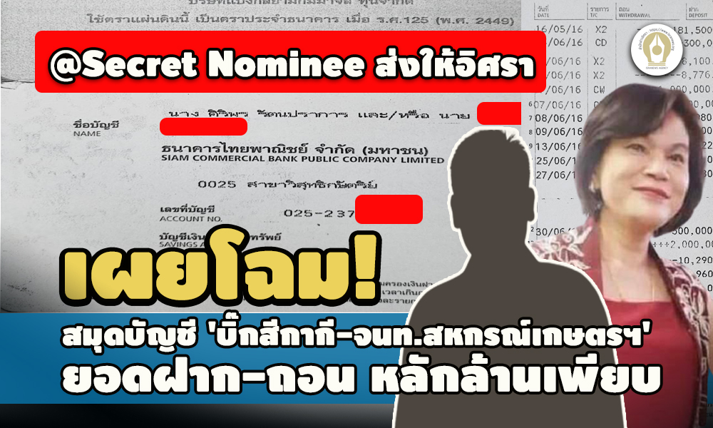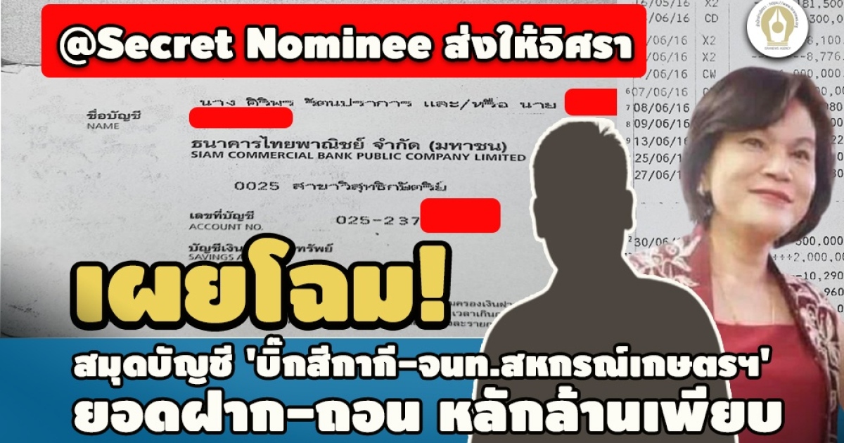 ล่าสุด สำนักข่าวอิศรา ได้รับมอบภาพถ่ายสมุดบัญชีเล่มนี้ จากแหล่งข่าวที่ไม่ประสงค์เปิดเผยสถานะตัวตน หรือให้เรียกว่า “Secret Nominee" พร้อมให้ข้อมูลเพิ่มเติมว่า รายการธุรกรรมทางการเงินในสมุดบัญชีเล่มนี้ มีความน่าสนใจอยู่ที่ยอดเงินฝาก-ถอนออก หลายครั้ง มีจำนวนเป็นหลักล้านบาท (ดูเอกสารประกอบ)