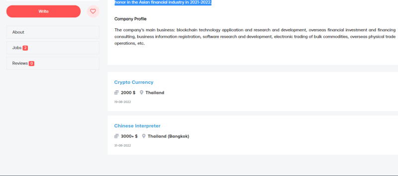 "...ในช่วงวันที่ 19 ส.ค.ที่ผ่านมาบริษัทเคยเปิดรับตำแหน่งคริปโตเคอร์เรนซี่ ให้ค่าตอบแทน 2,000 ดอลลาร์สหรัฐฯ (76,461 บาท) แต่ไม่ได้บอกว่าให้เป็นต่อสัปดาห์หรือว่าต่อเดือน และเปิดรับสมัครในตำแหน่งล่ามแปลภาษาจีน ให้ค่าตอบแทน 3,000 ดอลลาร์สหรัฐฯ (114,691 บาท) อย่างไรก็ตาม เมื่อผู้สื่อข่าวสำนักข่าวอิศราได้ติดต่อไปยังเบอร์โทรศัพท์ของผู้ที่ประกาศรับสมัครงาน ก็ปรากฎว่ามีผู้รับสาย แต่ว่าปลายสายไม่พูดอะไรเลย..."