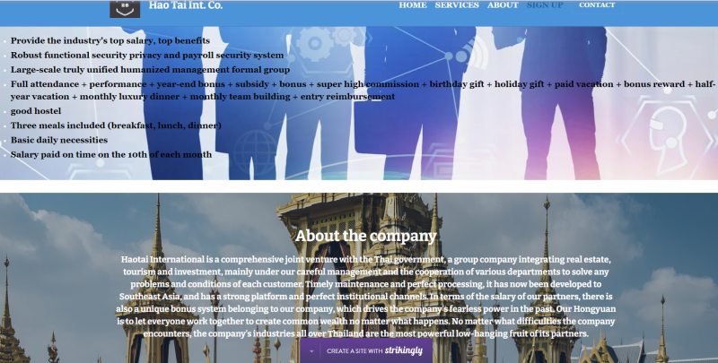 ทั้งนี้เมื่อผู้สื่อข่าวได้ลองใช้โปรแกรมแปลภาษาบนหน้าเว็บก็พบว่าบริษัทนี้ได้อ้างว่าเป็นบริษัทที่ร่วมทุนกับทางรัฐบาลไทย ในด้านอสังหาริมทรัพย์ การท่องเที่ยวและการลงทุน และยังมีการระบุว่าจะมีค่าตอบแทนพร้อมทั้งสิทธิ์ประโยชน์ อาทิ การจัดหาที่พัก อาหารสามมื้อให้กับลูกจ้าง รวมไปถึงโบนัสเป็นมูลค่าที่สูงมาก โดยจะจ่ายค่าตอบแทนในทุกวันทีสิบของเดือน (ดูภาพประกอบ)