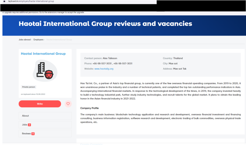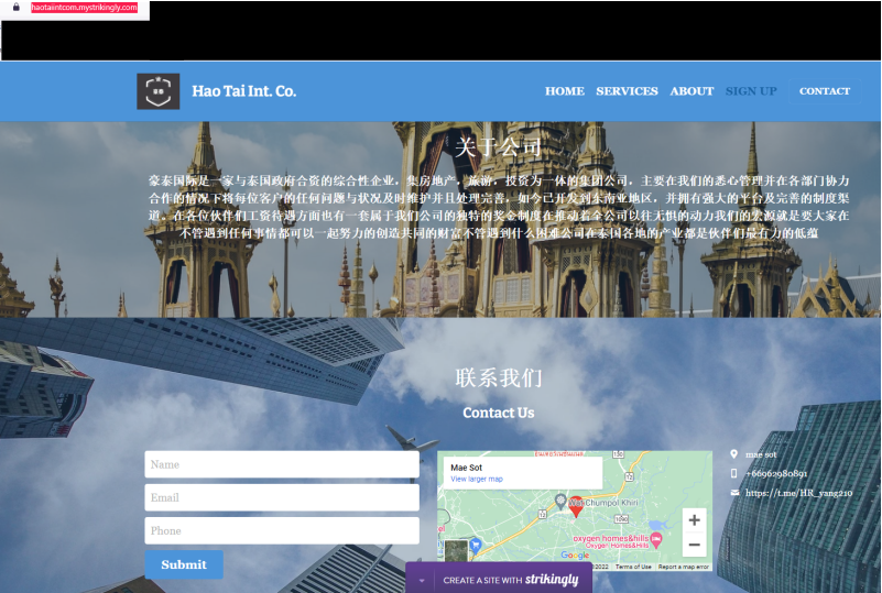 จากการตรวจสอบยังพบด้วยว่า บริษัทแห่งนี้มีเว็บไซต์ชื่อว่า https://haotaiintcom.mystrikingly.com ซึ่งจากการเข้าไปดูเว็บไซต์ดังกล่าวพบว่าเป็นเว็บไซต์ที่มีรายละเอียดเป็นภาษาจีนอย่างเดียว มีการระบุที่ตั้งว่าอยู่ที่ อ.แม่สอด และมีการโพสต์เบอร์โทรติดต่อ