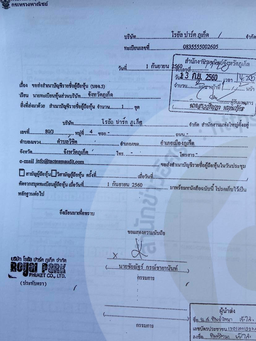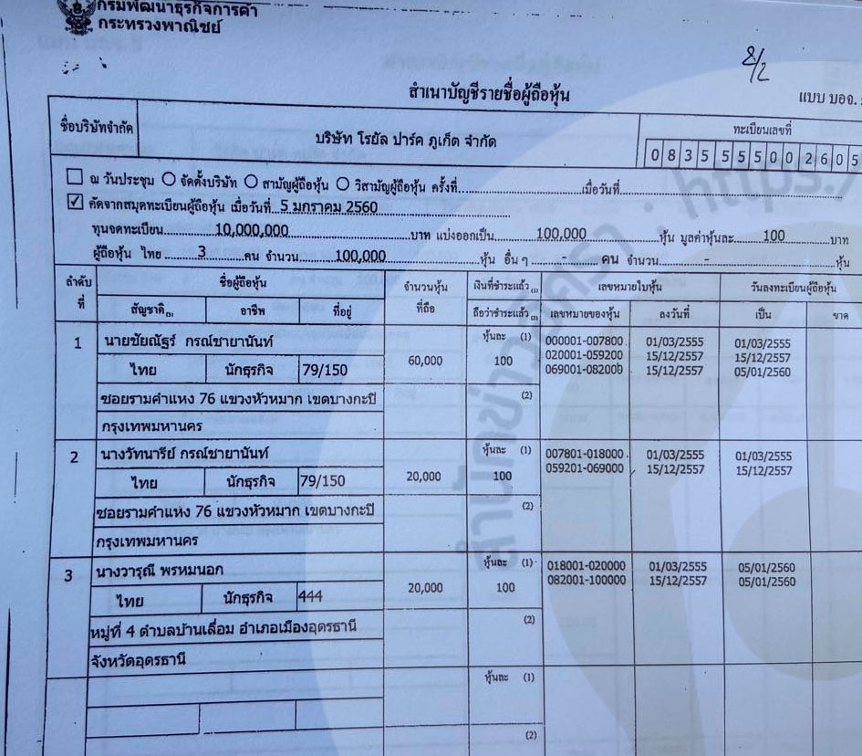 ทั้งนี้ บริษัท โรยัล ปาร์ค ภูเก็ต จำกัด จดทะเบียนวันที่ 1 มี.ค. 2555 ทุน 2 ล้านบาท (ล่าสุด 20 ล้านบาท) ประกอบกิจการแจ้งล่าสุดจำหน่ายยาสมุนไพร ที่ตั้ง 80/3 หมู่ 4 ตำบลวิชิต อำเภอเมืองภูเก็ต จังหวัดภูเก็ต มีผู้ถือหุ้น 3 คน นายหาวเจ๋อ ตู้ (นายชัยณัฐร์) 7,800 หุ้น น.ส.วัฒนารี คำนิล (นางวัทนารีย์) 10,200 หุ้น นายซาวเจ๋อ ตู้ (จีน) 2,000 หุ้น รวมหุ้นทั้งหมด 20,000 หุ้น มูลค่าหุ้นละ 100 บาท