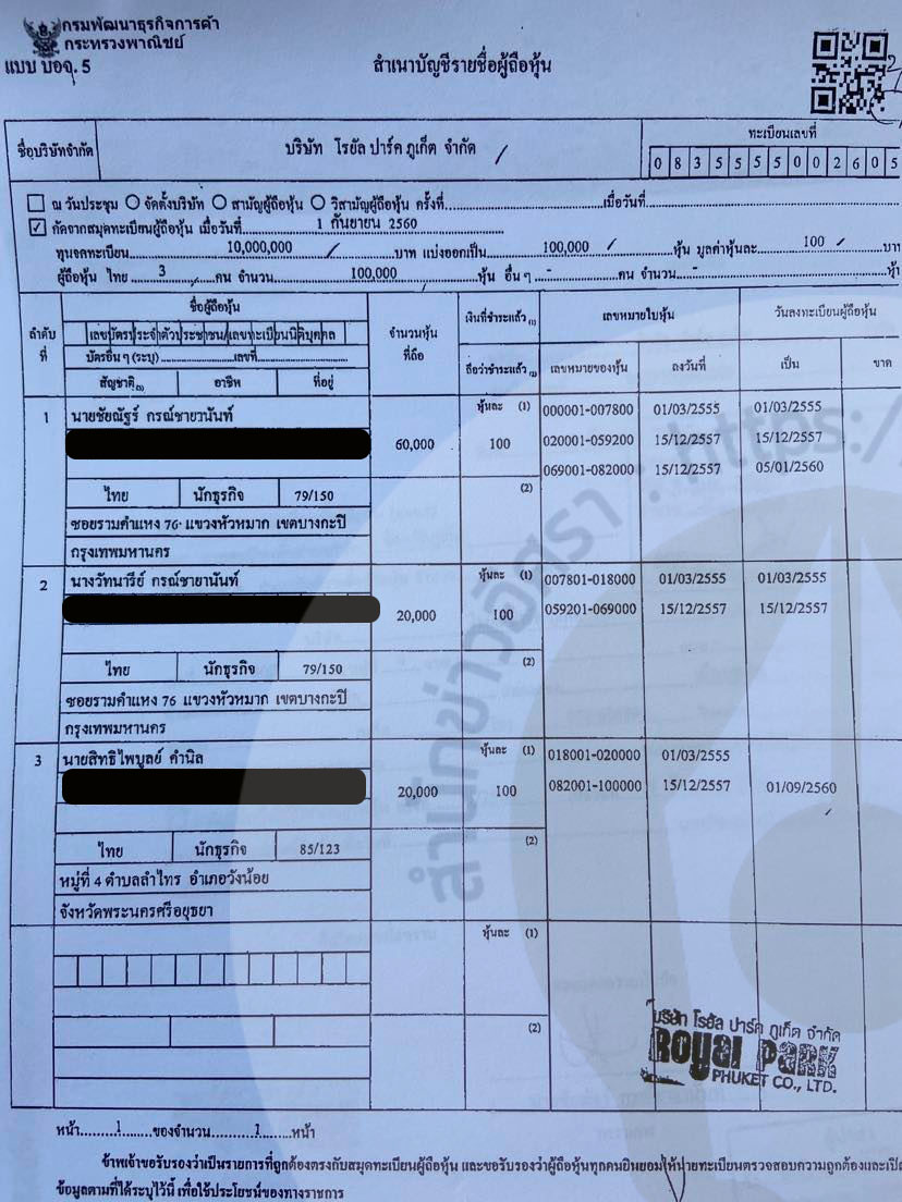 1 ก.ย.2560 (สำนักงานพาณิชย์จังหวัดภูเก็ตประทับรับเรื่องวันที่ 13 ก.ย.2560) ) นายชัยณัฐร์ กรณ์ชายานันท์ 60,000 หุ้น นางวัทนารีย์ กรณ์ชายานันท์ 20,000 หุ้น และ นายสิทธิไพบูลย์ คำนิล 20,000 หุ้น รวมหุ้นทั้งหมด 100,000 หุ้น มูลค่าหุ้นละ 100 บาท ( นางวารุณี พรหมนอก โอนให้ นายสิทธิไพบูลย์)