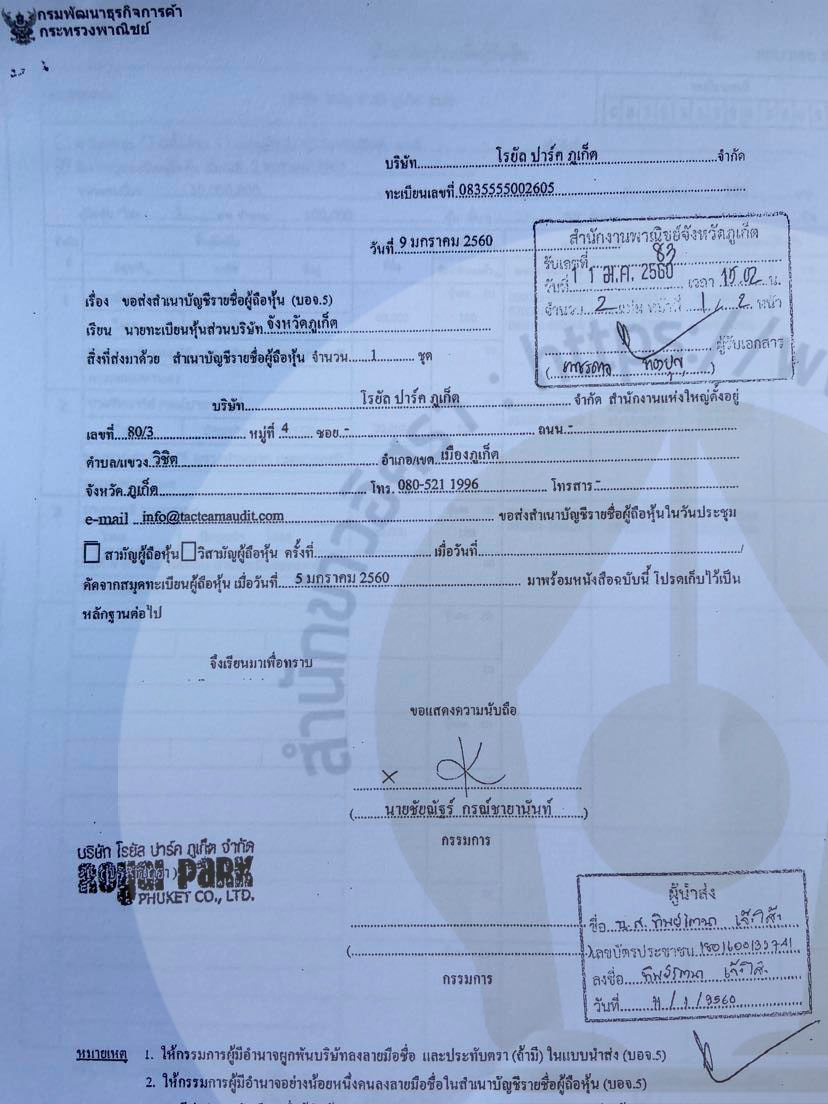 5 ม.ค.2560 (นำส่งนายทะเบียนหุ้นส่วนบริษัทจังหวัดภูเก็ต 9 ม.ค.2560 ประทับรับเรื่องเมื่อ 11 ม.ค.2560) นายชัยณัฐร์ กรณ์ชายานันท์ 60,000 หุ้น นางวัทนารีย์ กรณ์ชายานันท์ 20,000 หุ้น และ นางวารุณี พรหมนอก 20,000 หุ้น รวมหุ้นทั้งหมด 100,000 หุ้น มูลค่าหุ้นละ 100 บาท นายชัยณัฐร์ กรณ์ชายานันท์ เป็นกรรมการ (ดูเอกสาร)