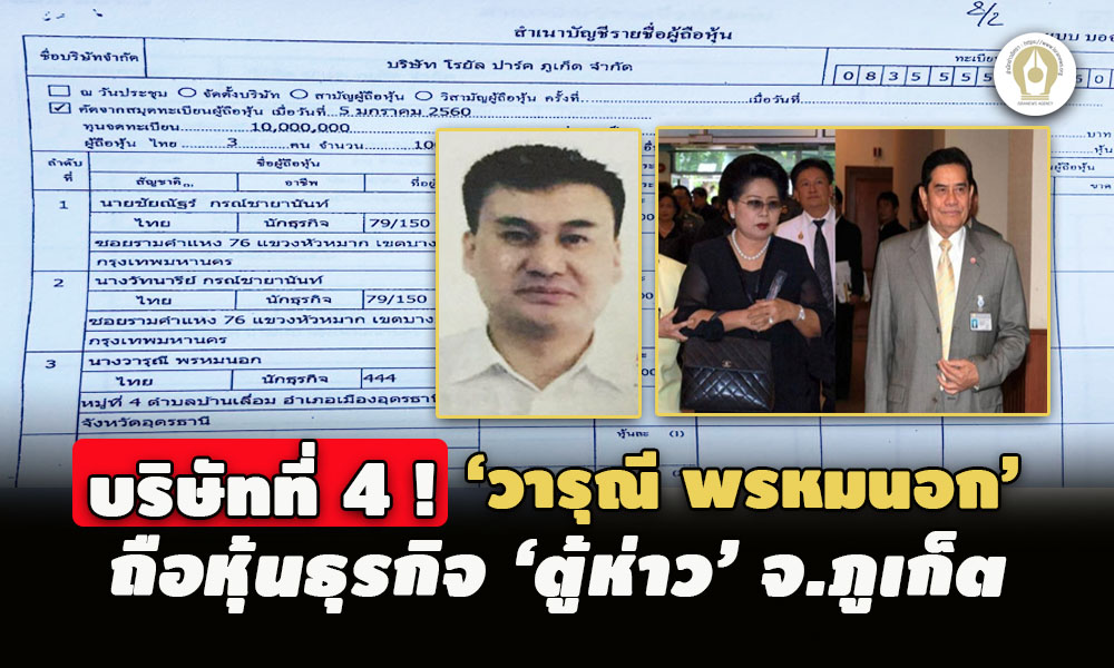 ไม่ใช่แค่ 3 ! เจออีก ‘วารุณี พรหมนอก’ ภรรยา พล.ต.อ.ประชา อดีตรองนายกฯร่วมถือหุ้น บ.โรยัล ปาร์ค ภูเก็ต ‘ ตู้ห่าว’ ทุนจีน 20,000 หุ้น ขายยาสมุนไพร ก่อนโอนให้ ‘สิทธิไพบูลย์’ เครือญาติ ปลายปี 2560 ช่วงเวลาไล่เลี่ย 3 บริษัทก่อนหน้า มูลค่าเบ็ดเสร็จ 4 แห่ง 18 ล.