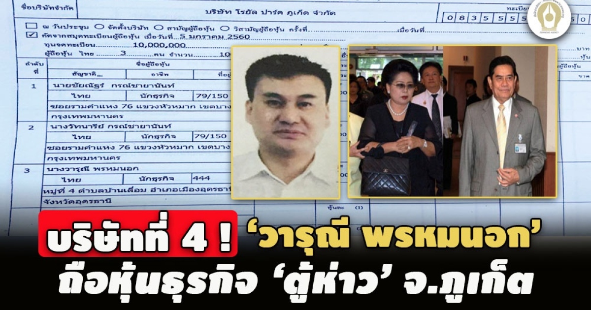 รายนางวารุณี พรหมนอก ล่าสุดพบข้อมูลถือหุ้นร่วมกับ นายชัยณัฐร์ กรณ์ชายานันท์ อีก 1 บริษัทชื่อ บริษัท โรยัล ปาร์ค ภูเก็ต จำกัด จำนวน 20,000 หุ้น มูลค่า 2 ล้านบาท (ตามทุนจดทะเบียน) เมื่อวันที่ 5 ม.ค.2560