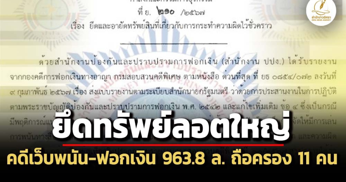 ปปง.ยึดอายัดทรัพย์บิ๊กลอตคดีเล่นพนันออนไลน์ กลุ่ม‘สง่า กังวาล’กับพวก 372 รายการ 963.8 ล้าน โฉนดที่ดิน น.ส.3ก. สิ่งปลูกสร้าง ห้องชุด เงินฝาก กรมธรรม์ฯ หลักทรัพย์ หน่วยลงทุน เงินสด รถยนต์ เครื่องประดับ พระเครื่อง ถือครอง 11 คน เบื้องหลังดีเอสไอชง เปิดหลายเว็บ แบ่งหน้าที่ 5 กลุ่ม ทุนหมุนเวียนนับพันล้าน
