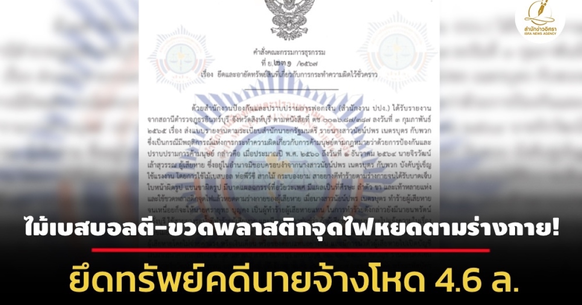 ปปง.ตามยึดทรัพย์ คดี ‘นัยน์ปพร เนตรบุตร’ นายจ้างกับพวก ที่ดิน เงินฝาก 11 รายการ 4.6 ล้าน แฉพฤติกรรมร่วมทำร้ายลูกจ้างโหดเหี้ยม ใช้ไม้เบสบอล ท่อพีวีซี สากไม้ กระบองยาม สายยางตี ใบหน้าแขนขาผิดรูป บาดแผลฉกรรจ์อวัยวะเพศ ศีรษะ ลำตัว ขา เท้า ใช้ขวดพลาสติกจุดไฟหยดตามร่างกาย ศาลชั้นต้นพิพากษาลงโทษ 3 คน จำคุกคนละ 14 ปี 6 เดือน ปรับคนละ 1,220,000 บาท ร่วมชดใช้ 6.7 ล.
