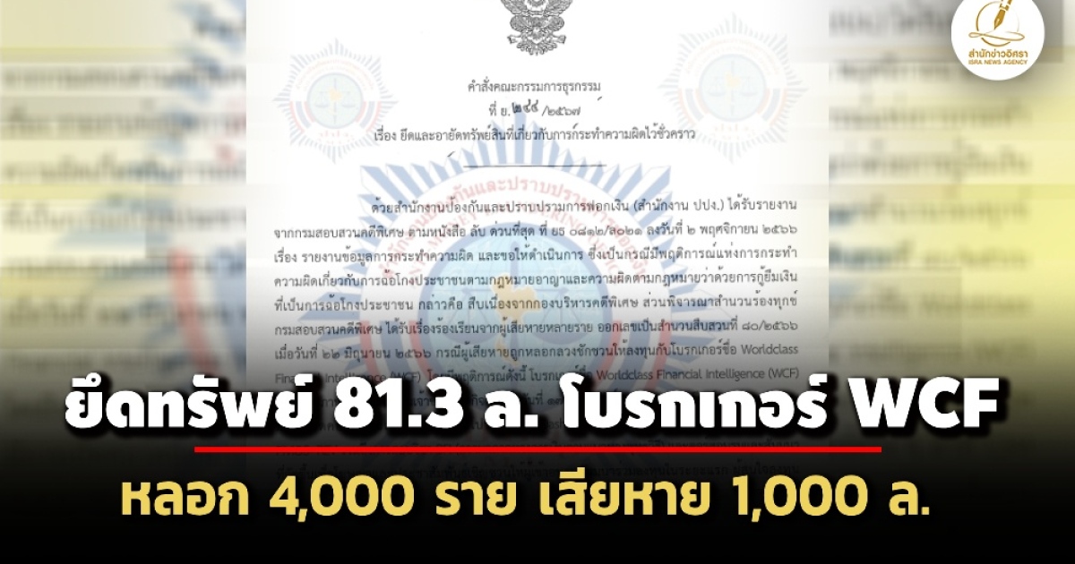 ปปง.สั่งยึดอายัดทรัพย์คดี‘ภานุวัชร ใจมั่น’กับพวก จำนวน 22 รายการ รวมมูลค่า 81.3 ล้าน ฐานฉ้อโกงฟอกเงิน ชักชวนลงทุนผ่านโบรกเกอร์ WCF สอนเทรด FOREX โปรแกรม Al ให้ผลตอบแทนสูง เหยื่อ 4,000 ราย เสียหาย 1,000 ล้าน