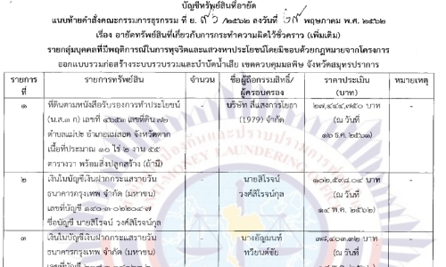 ทั้งนี้ เมื่อวันที่ 29 พ.ค.2562 คณะกรรมการธุรกรรม ปปง. มีคำสั่งที่ ย.96/2562 อายัดทรัพย์สินเพิ่มเติมกลุ่มบุคคลที่มีพฤติการณ์ในการทุจริตและแสวงหาประโยชน์โดยมิชอบด้วยกฎหมายจากโครงการ ออกแบบรวมก่อสร้างระบบรวบรวมและบําบัดน้ำเสีย เขตควบคุมมลพิษ จ.สมุทรปราการ รวม 5 รายการ
