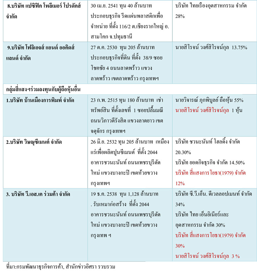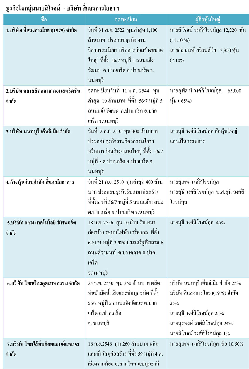 3.ห้างหุ้นส่วนจำกัด สี่แสงโยธาการ จดทะเบียนวันที่ 21 กันยายน 2510 ทุนล่าสุด 400 ล้านบาท ประกอบธุรกิจรับเหมาก่อสร้าง ที่ตั้งเลขที่ 56/7 หมู่ที่ 5 ถนนแจ้งวัฒนะ ต.ปากเกร็ด อ.ปากเกร็ด จ.นนทบุรี ณ วันที่ 28 ม.ค. 2553 นายสุเทพ วงศ์สิโรจน์กุล นายสุธี วงศ์สิโรจน์กุล น.ส.สุนี วงศ์สิโรจน์กุล นางอัญมนท์ ทวียนต์ชัย และคนสกุลวงศ์สิโรจน์กุล รวม 10 คน ร่วมกันถือหุ้น นายสุเทพ วงศ์สิโรจน์กุล ลงหุ้นใหญ่ 11.97% แจ้งผลประกอบการล่าสุดรอบปีสิ้นสุด วันที่ 31 ธ.ค.2560 รายได้ 209,311,441.82 บาท กำไรสุทธิ 9,075,529.21 บาท สินทรัพย์ 333,590,758.66 บาท หนี้สิน 132,203,521.63 บาท ขาดทุน สะสม 198,612,762.97 บาท