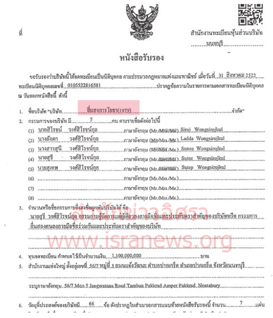 นายสุพัฒน์ วงศ์สิโรจน์กุล น.ส. สุนี วงศ์สิโรจน์กุล นายสุธี วงศ์สิโรจน์กุล และ นายสุเทพ วงศ์สิโรจน์กุล เป็นกรรมการ แจ้งผลประกอบการล่าสุดรอบปีสิ้นสุด 31 ธ.ค.2560 รายได้ 181,494,041.55 บาท กำไรสุทธิ 16,909,971.08 บาท สินทรัพย์ รวม 96,669,142.43 บาท หนี้สิน 41,177,824.27 บาท กำไรสะสม 45,491,318.16 บาท