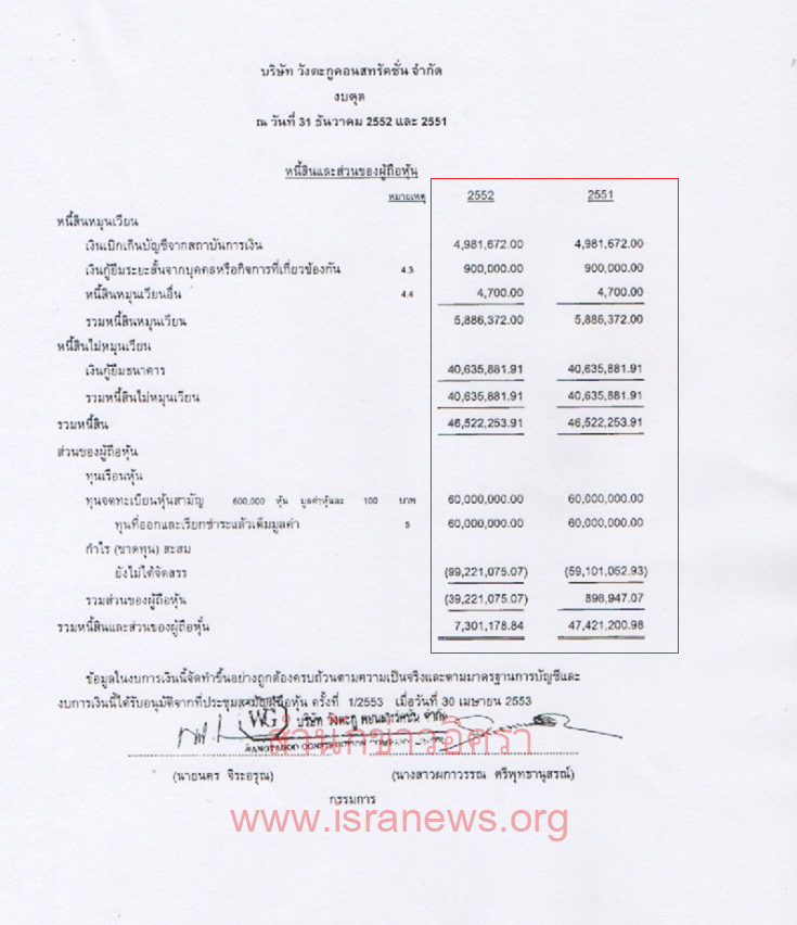 แจ้งงบการเงินล่าสุดรอบปีสิ้นสุด 31 ธ.ค.2552 ไม่มีรายได้ (ไม่มีรายได้ 2550-2552) ขาดทุนสุทธิ 40,120,022.14 บาท สินทรัพย์ 7,301,178.84 บาท หนี้สิน 46,522,253.91 บาท ขาดทุนสะสม 99,221,075.07 บาท