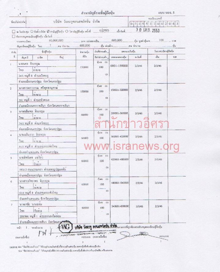 บริษัท วังตะกูคอนสทรัคชั่น จำกัด จดทะเบียนวันที่ 5 ก.ย. 2537 ทุน 5 ล้านบาท ในชื่อ บริษัท ซี.เอ.คอนสทรัคชั่น 1994 จํากัด ต่อมา 26 ธ.ค. 2545 เปลี่ยนชื่อเป็น บริษัท วังตะกูคอนสทรัคชั่น จำกัด เพิ่มทุนเป็น 60 ล้านบาท ที่ตั้งเลขที่ 34/1 หมู่ที่ 8 ต.วังตะกู อ.เมืองนครปฐม จ.นครปฐม ผู้ถือหุ้น 7 คน นายนคร จิระอรุณ อยู่บ้านเลขที่ 34/1 หมู่ที่ 8 ต.วังตะกู อ.เมืองนครปฐม จ.นครปฐม ถือหุ้นใหญ่ 12,500 หุ้น น.ส.ผกาวรรณ ศรีพุทธานุสรณ์ 12,500 หุ้น ที่เหลืออีก 5 คน คนสกุล จิระอรุณ คนละ 5,000 หุ้น รวมทั้งหมด 50,000 หุ้น มูลค่าหุ้นละ 100 บาท ต่อมาเพิ่มเป็น 60 ล้านบาท ผู้ถือหุ้นล่าสุด ณ วันที่ 30 เม.ย.2553 นายนคร และ น.ส.ผกาวรรณ คนละ 150,000 หุ้น (คนละ 25%) อีก 5 คนๆละ 60,000 หุ้น คนละ 10% จากทั้งหมด 600,000 หุ้น