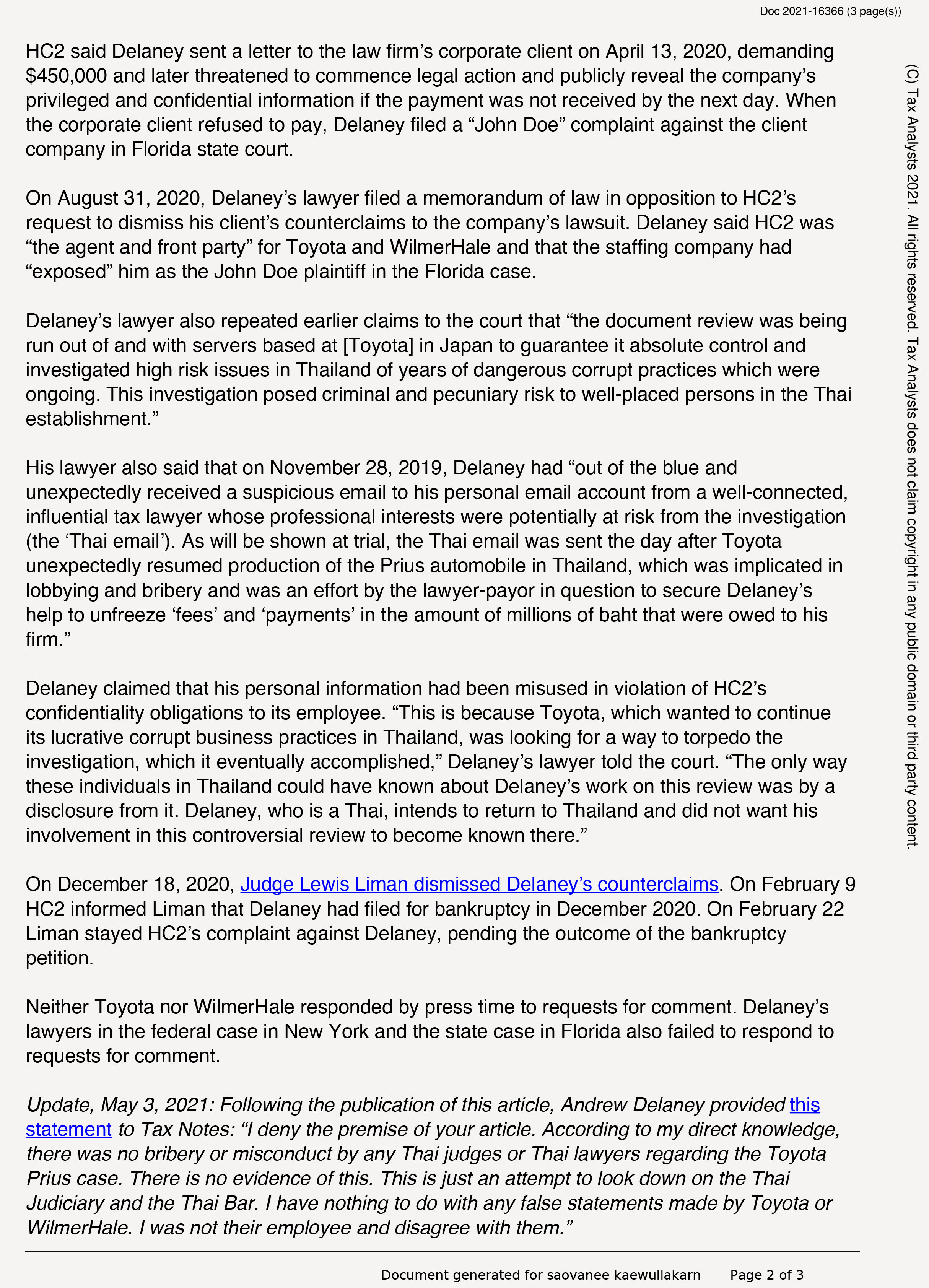 "...เว็บไซต์ taxnotes ยังได้รายงานต่อไปว่า การเปิดเผยข้อมูลความเป็นไปได้ว่าจะมีการให้สินบนในเว็บไซต์ LAW360 นั้น แท้จริงแล้วเกิดขึ้นหลังจากที่มีการฟ้องร้องกันระหว่างบริษัทที่ชื่อว่าไฮร์คอนเซล (HC2) ที่ถูกว่าจ้างมาจากบริษัทวิลเมอร์เฮลอีกต่อหนึ่ง เพื่อให้ดำเนินการสอบสวนภายในให้กับบริษัทโตโยต้ากับนายแอนดรูว์ เดลานีย์..."