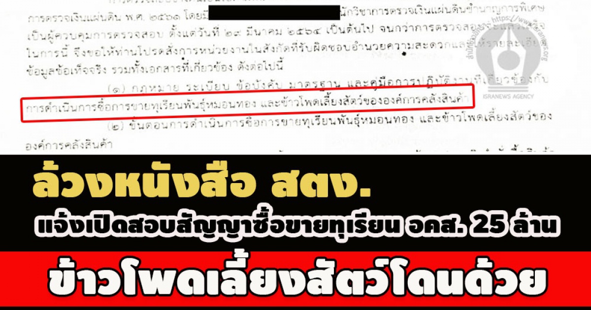 ล่าสุด สำนักข่าวอิศรา ตรวจสอบหนังสือ สตง. ที่แจ้ง อคส. เพื่อขอส่งเจ้าหน้าที่เข้าตรวจสอบข้อมูลกรณีการทำสัญญาซื้อทุเรียนพันธุ์หมอนทอง ระหว่าง อคส.กับเอกชน ว่าการดำเนินการเป็นไปตาม กฎหมาย ระเบียบข้อบังคับ มาตรฐาน และคู่มือการปฏิบัติของ อคส. หรือไม่ พร้อมขอให้ อคส. จัดส่งข้อมูลเอกสารหลักฐานที่เกี่ยวข้องทั้งหมดมาใช้ประกอบการตรวจสอบด้วยดังกล่าว